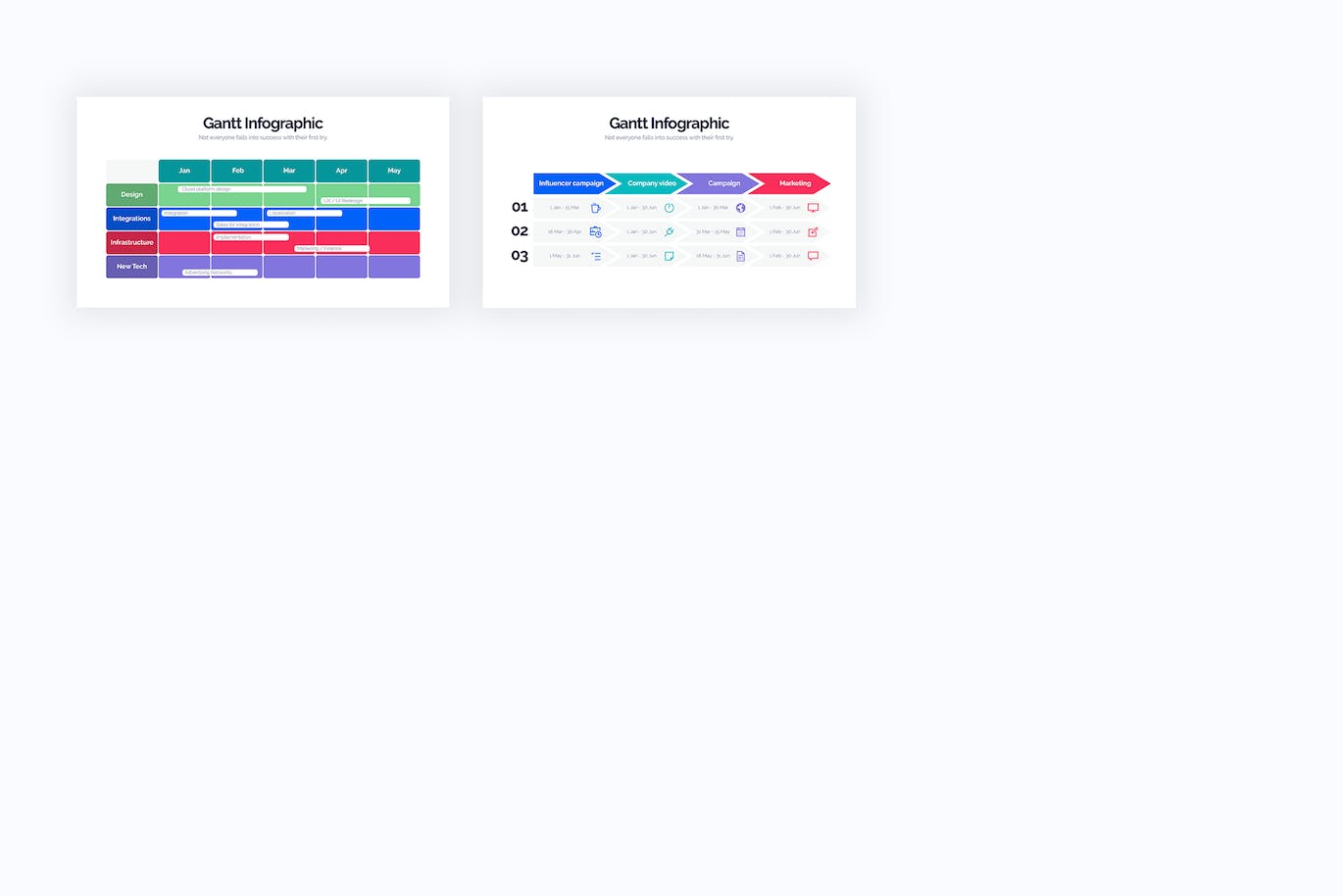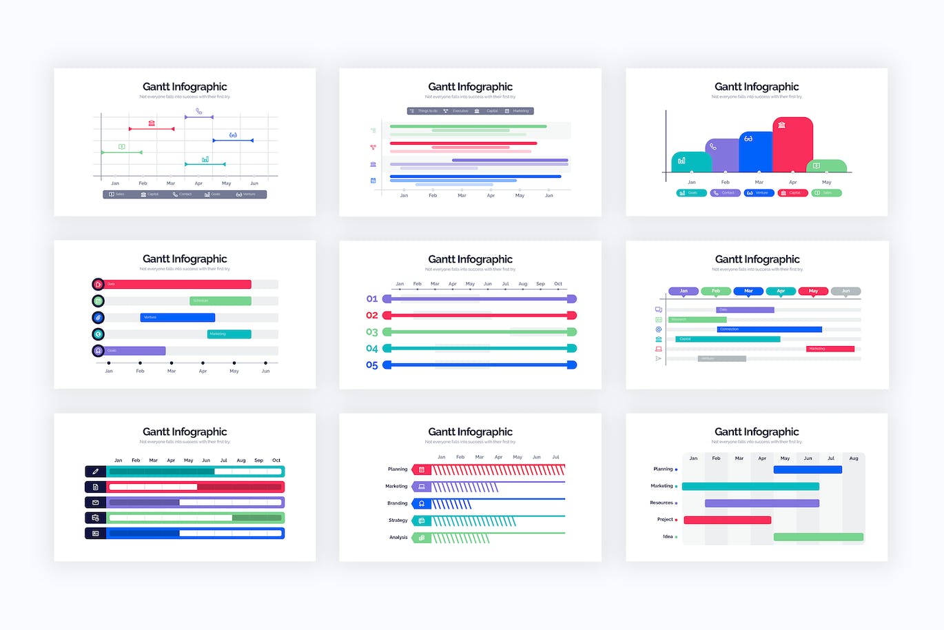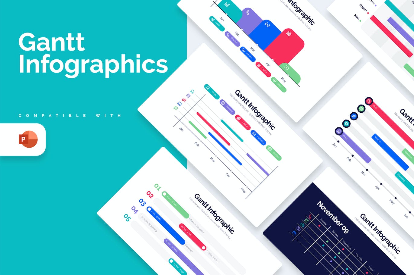与Powerpoint兼容的现代甘特信息图形模板。易于编辑的业务演示幻灯片。