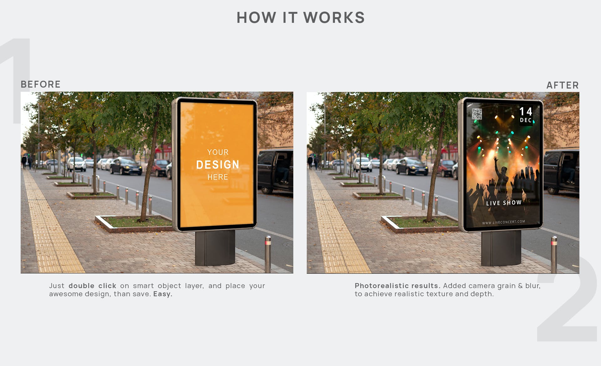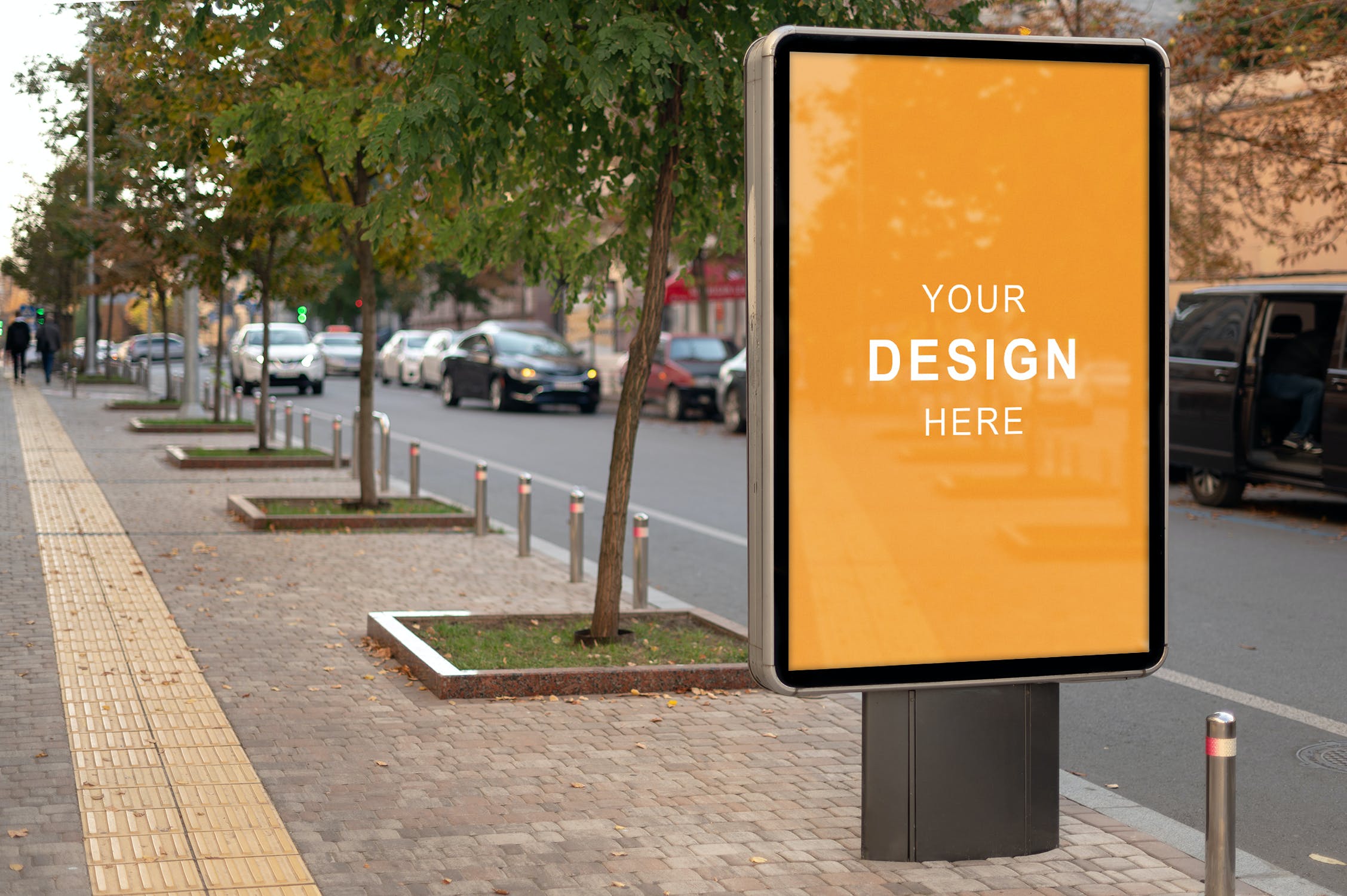 秋季城市街道灯箱广告海报展示样机,高分辨率图像,分辨率为300 DPI。对于网站、UI/UX设计、设计师、内容制作者、博客作者和摄影师,无论是专业人士还是业余爱好者,都是以专业、有趣和可视化的方式展示其作品的绝佳解决方案。这个样机已经用不同的图片进行了测试,效果非常好。这些调整非常智能、干净且易于操作。