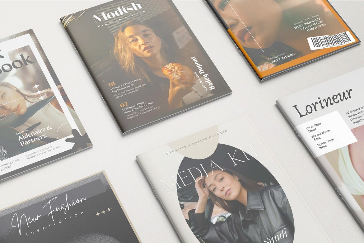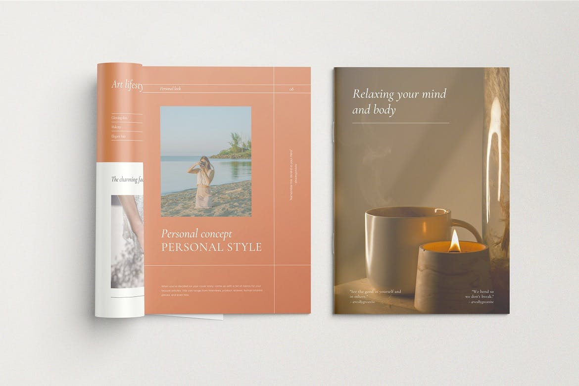 本项目由6种不同风格的手册/目录样机组成,以真实的外观展示您的设计。这些样机文件使用智能对象功能,可帮助您在几秒钟内更改设计。
