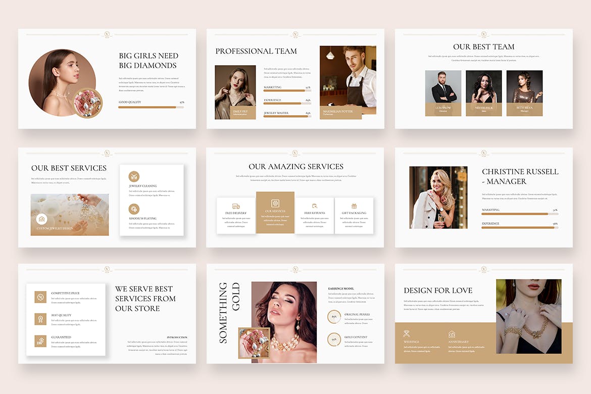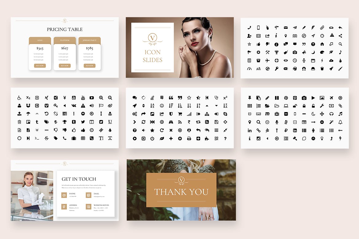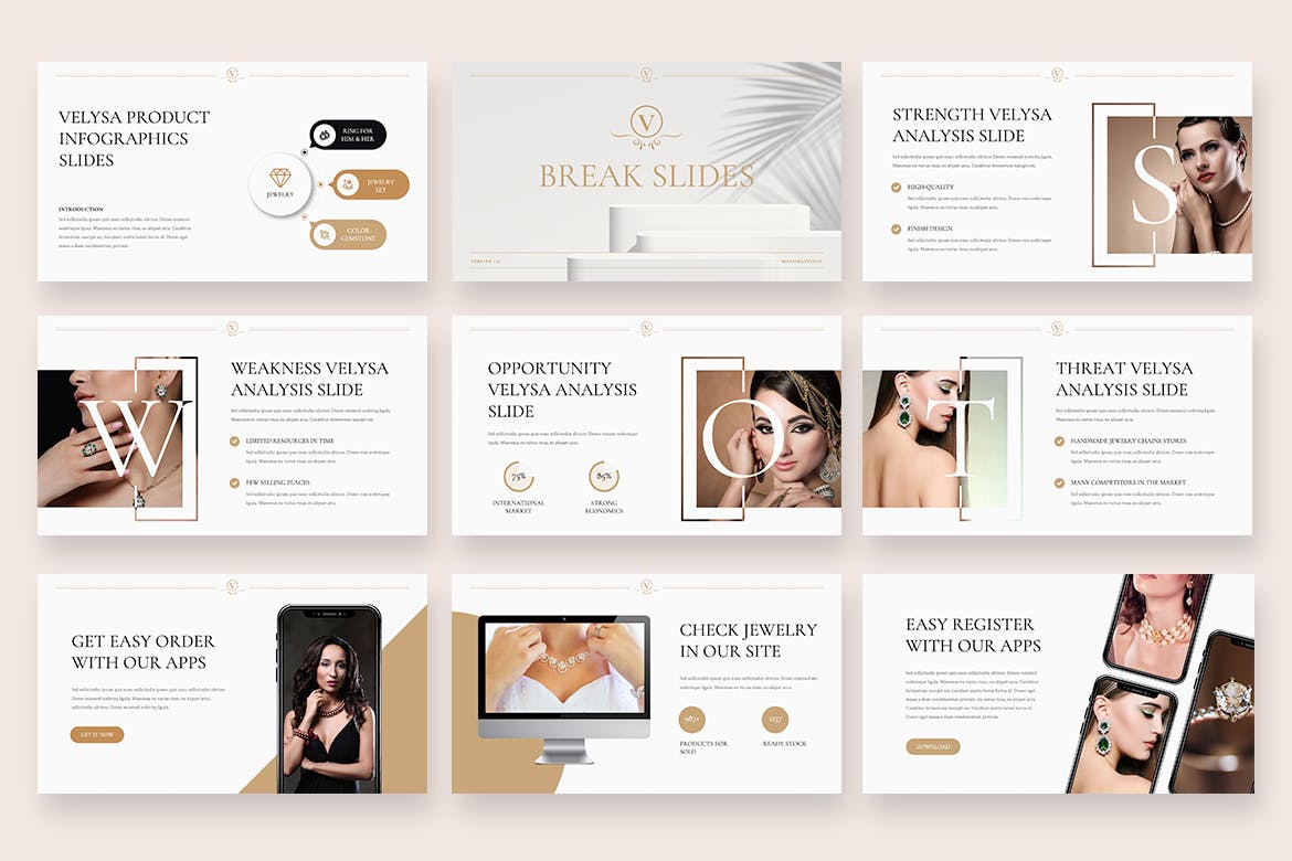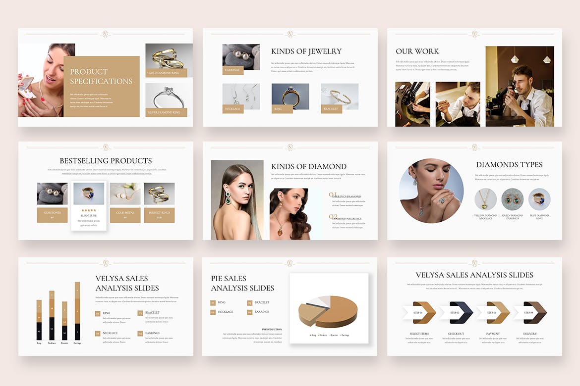 VELYSA–珠宝制造商和商店Powerpoint模板是一个多用途珠宝Powerpoint模板,可用于任何类型的演示:商业、投资组合、公司、商业、手表、产品,也可用于定制生产。