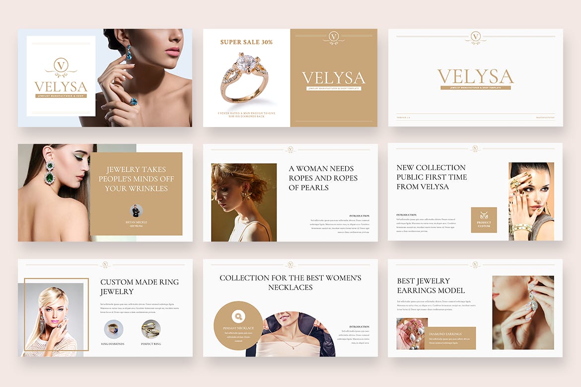 VELYSA–珠宝制造商和商店Powerpoint模板具有专业、超现代和独特的设计,其中每一张幻灯片都充满了对细节的热爱和关注。