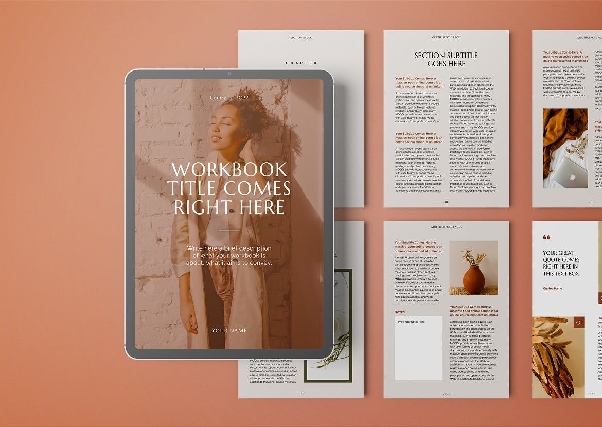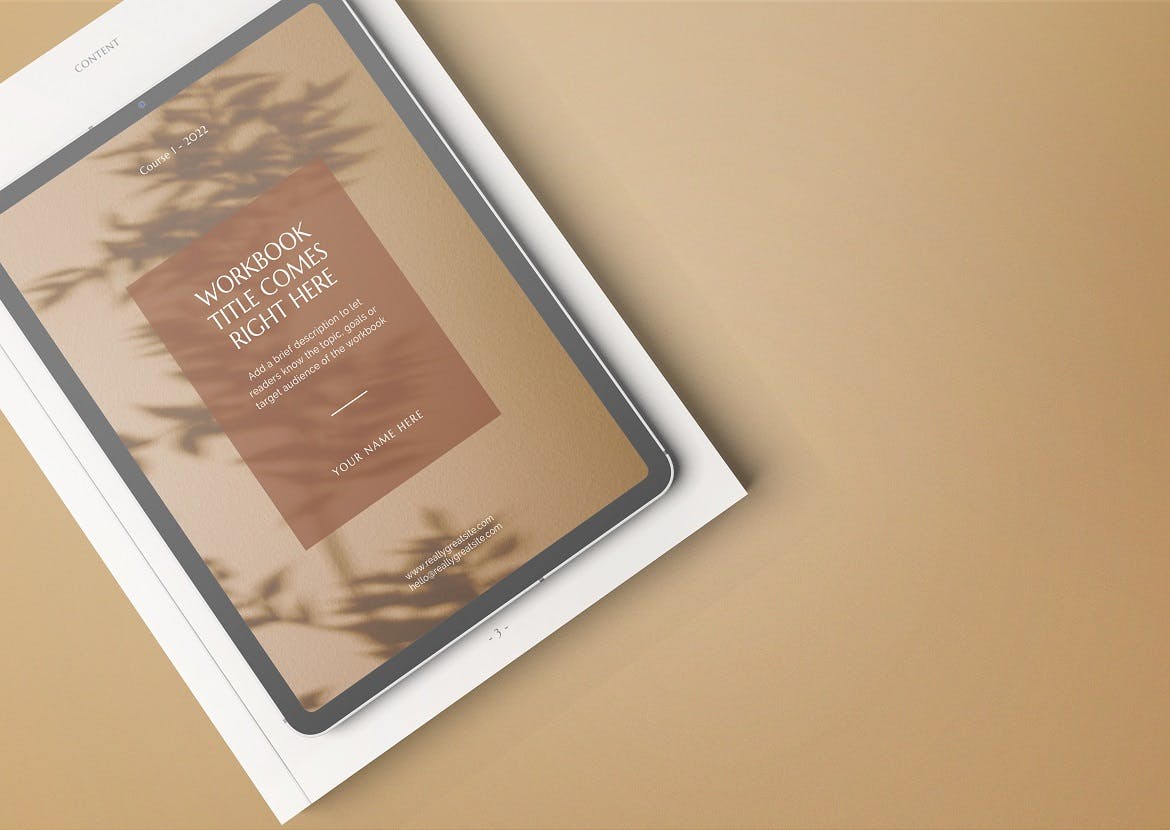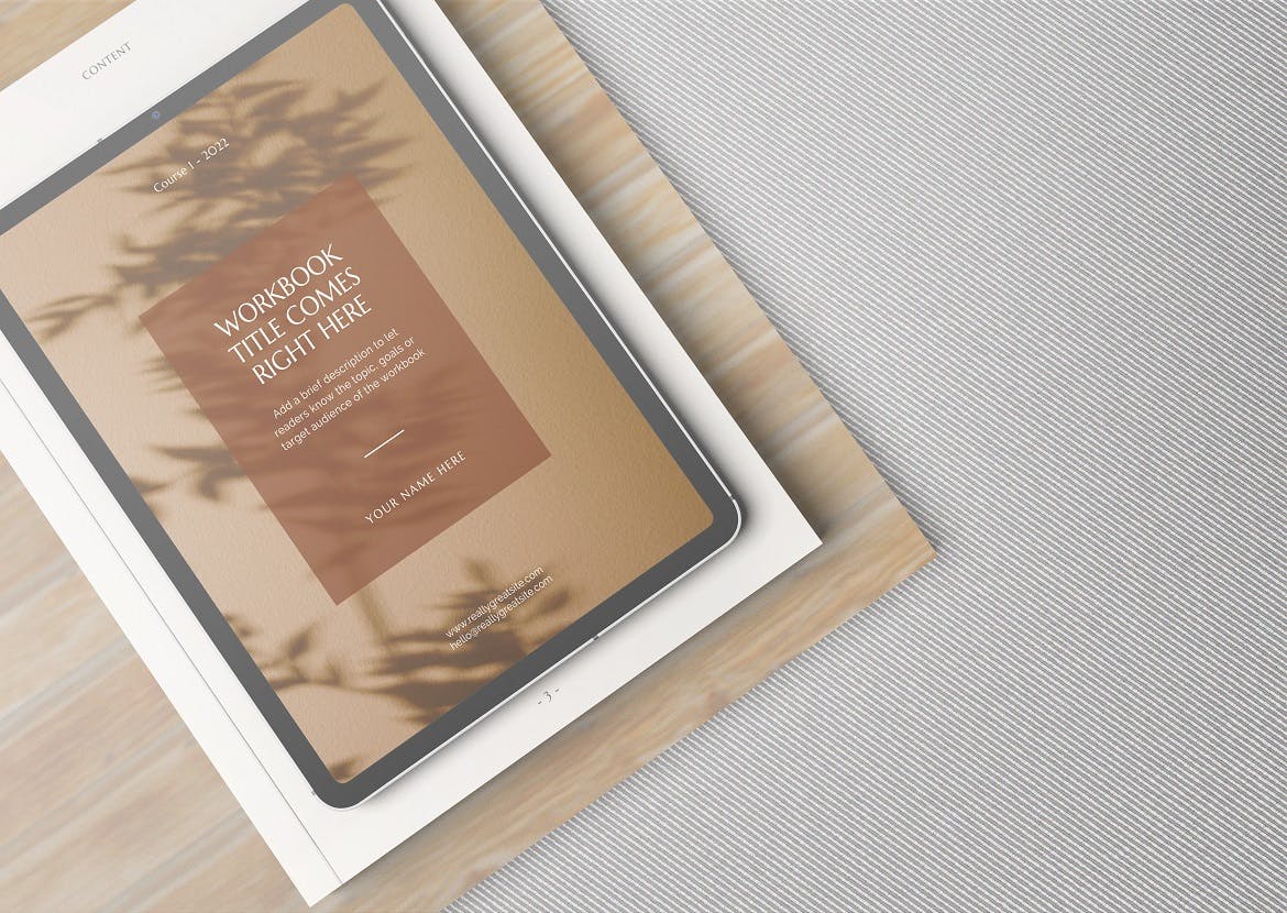 该样机设计用于帮助您制作自己的工作坊手册、在线课堂工作簿、网络研讨会/研讨会指南、社交媒体指南、工作室/商业手册、大师班工作簿等。该样机以Psd格式提供。