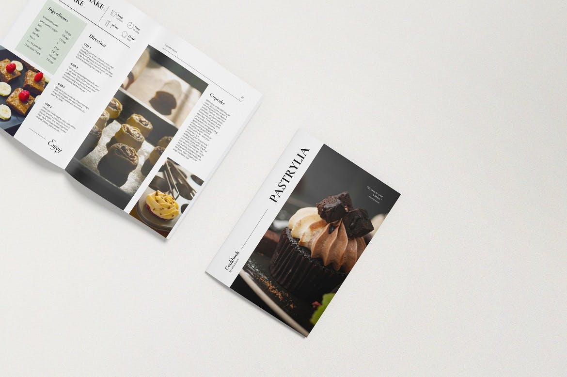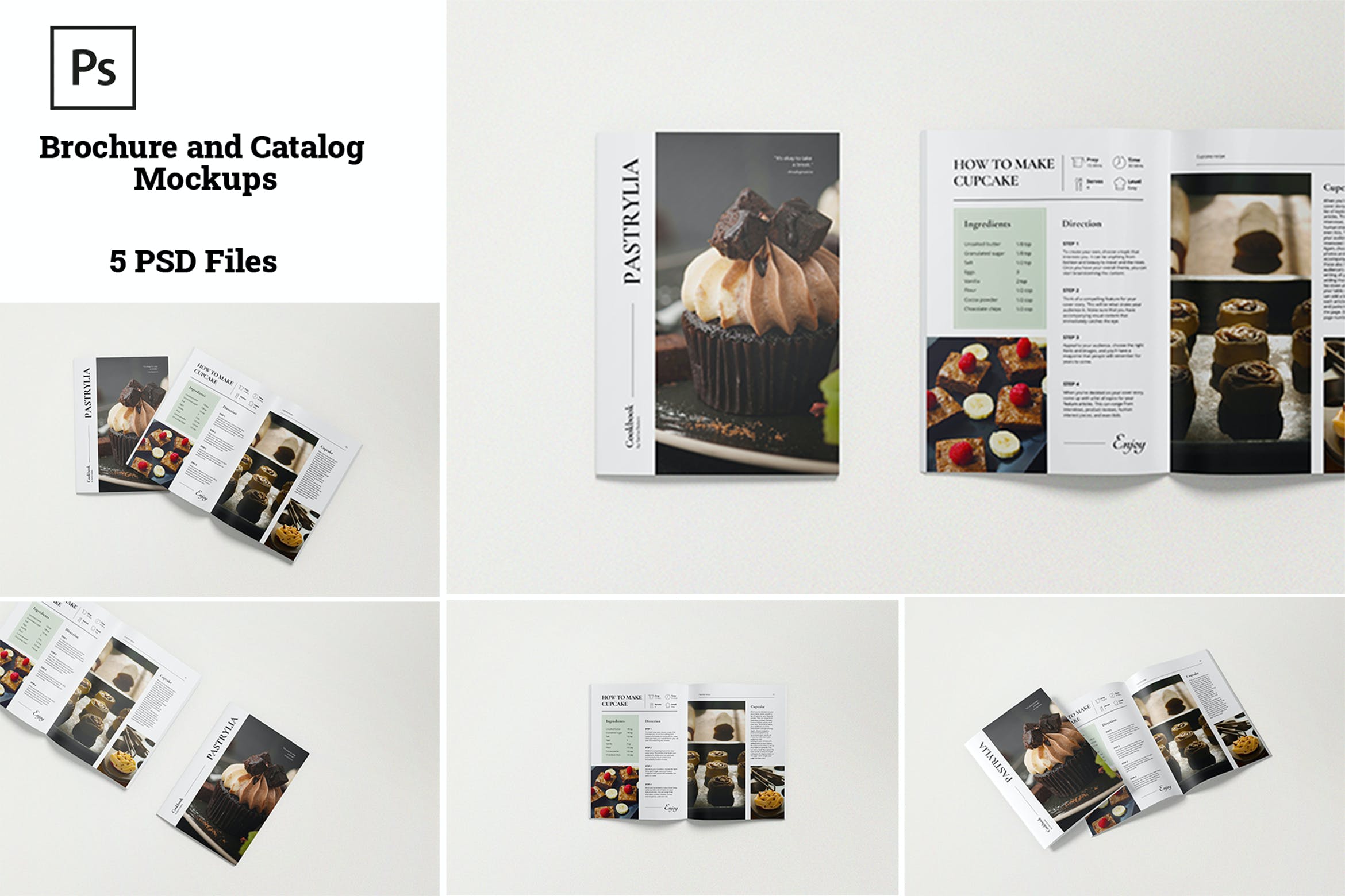 本项目由5种不同风格的手册/目录样机组成,以真实的外观展示您的设计。这些样机文件使用智能对象功能,可帮助您在几秒钟内更改设计。