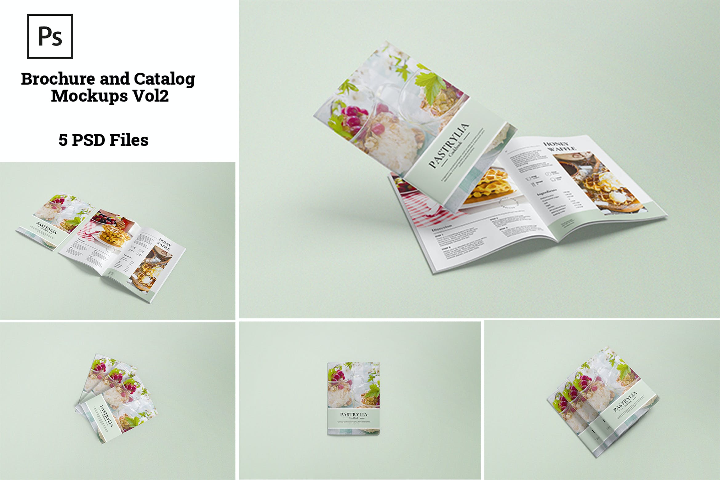 本项目由5种不同风格的手册/目录样机组成,以真实的外观展示您的设计。这些样机文件使用智能对象功能,可帮助您在几秒钟内更改设计。