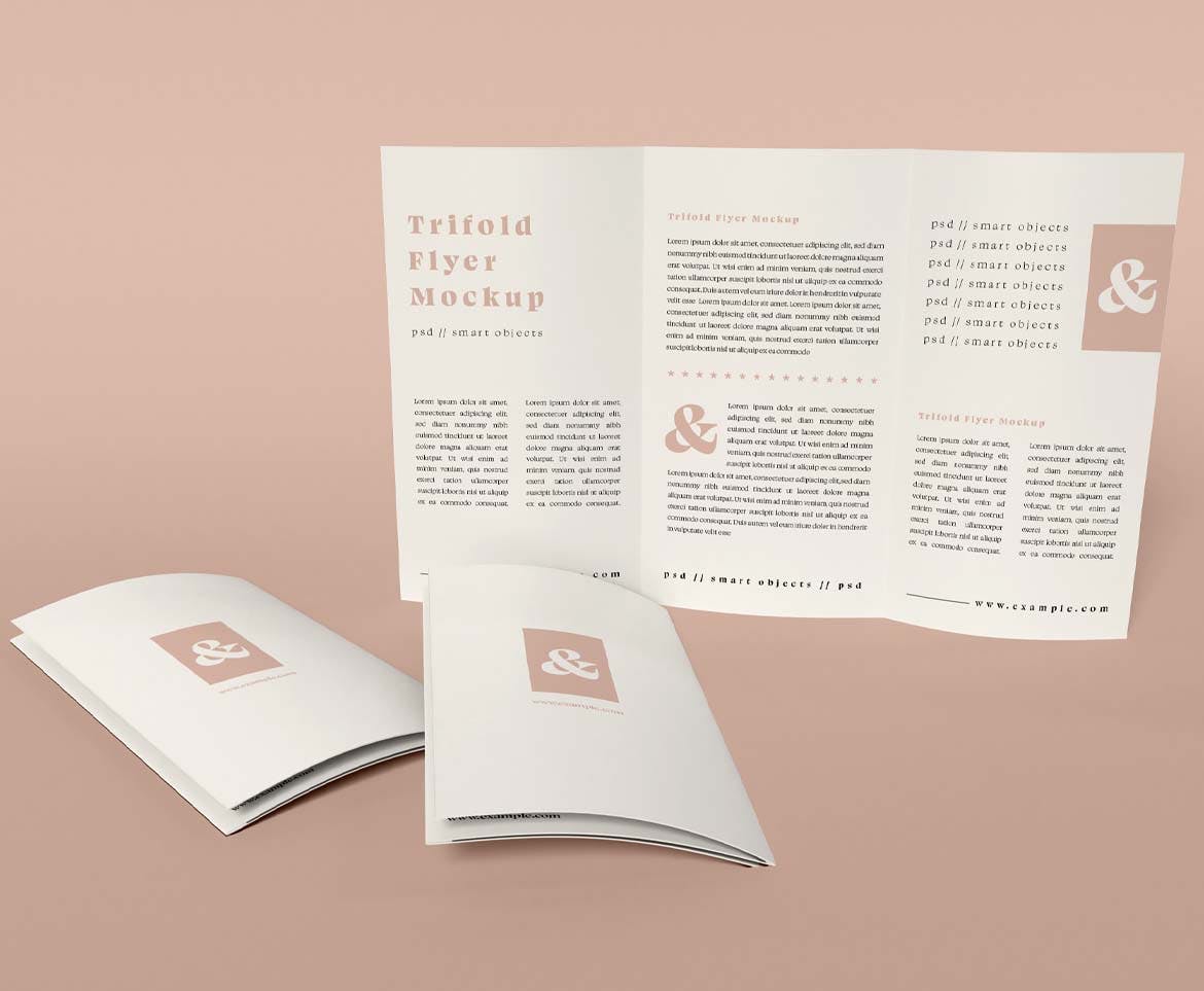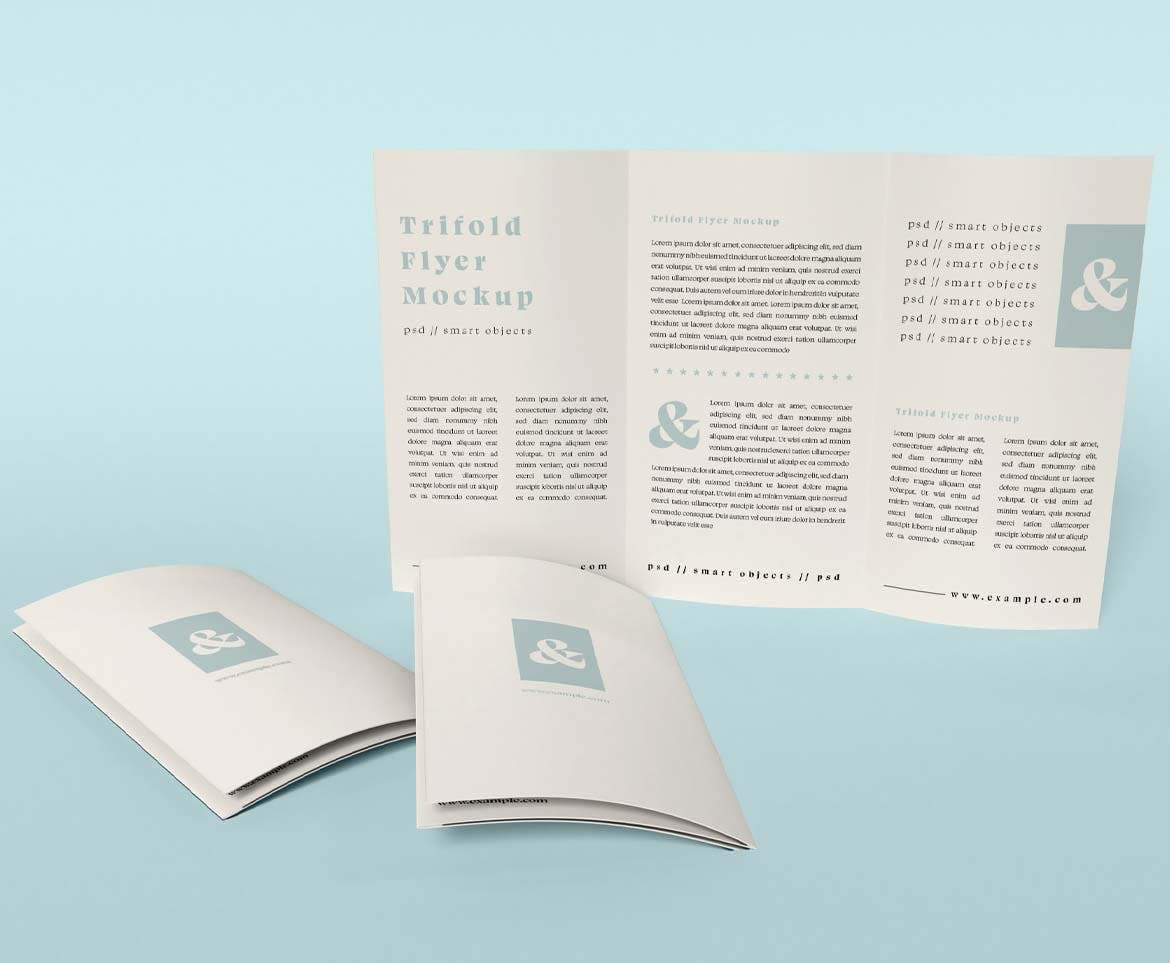 三折页广告宣传单效果图样机,有一个智能对象,可帮助您调整设计。只需将其拖放即可, 使用起来非常简单。 通过使用纯色图层,易于重新着色。高分辨率(300 dpi)。