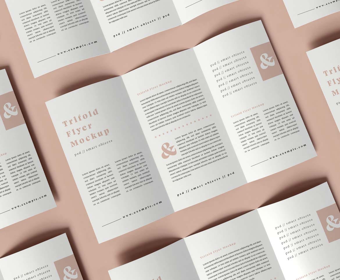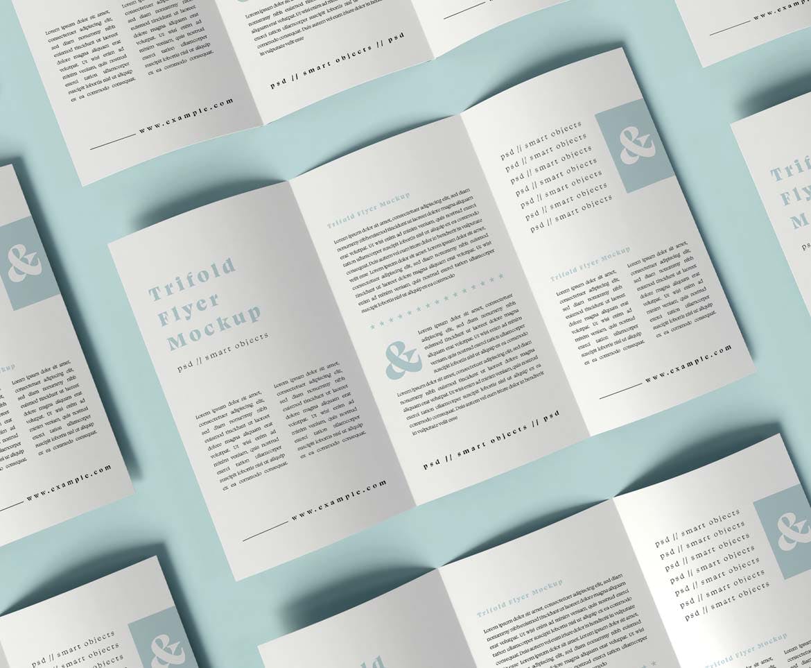 三折页广告宣传单设计样机,有一个智能对象,可帮助您调整设计。只需将其拖放即可, 使用起来非常简单。 通过使用纯色图层,易于重新着色。高分辨率(300 dpi)。