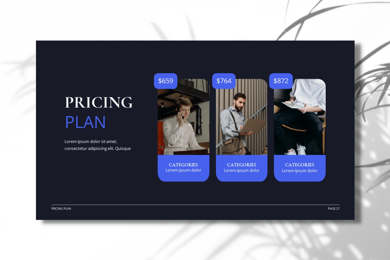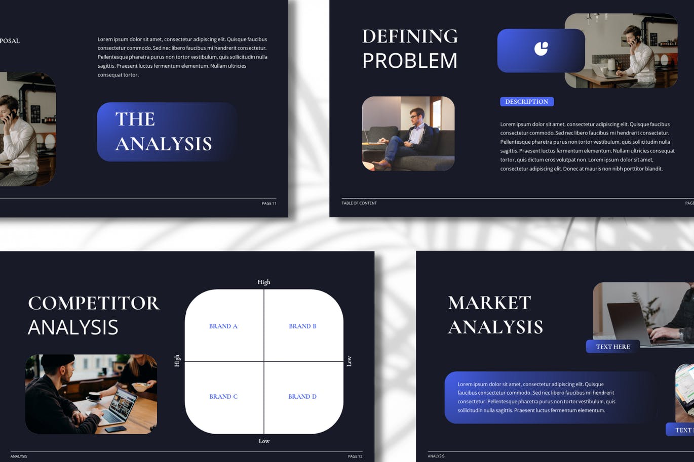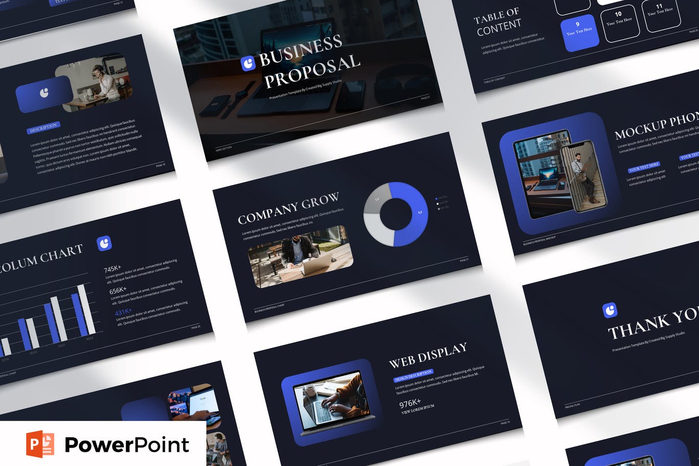 此Powerpoint商业提案演示模板非常适合各种公司展示商业想法。具有现代、专业、典雅、简约的设计理念。