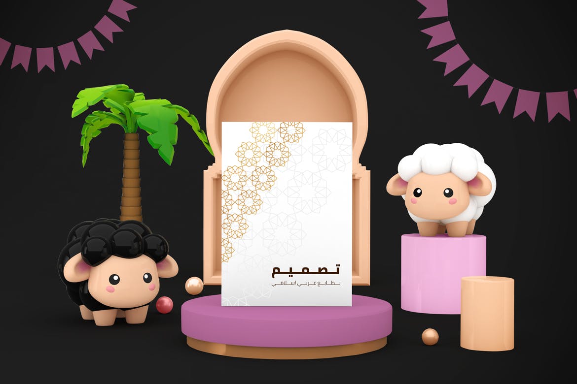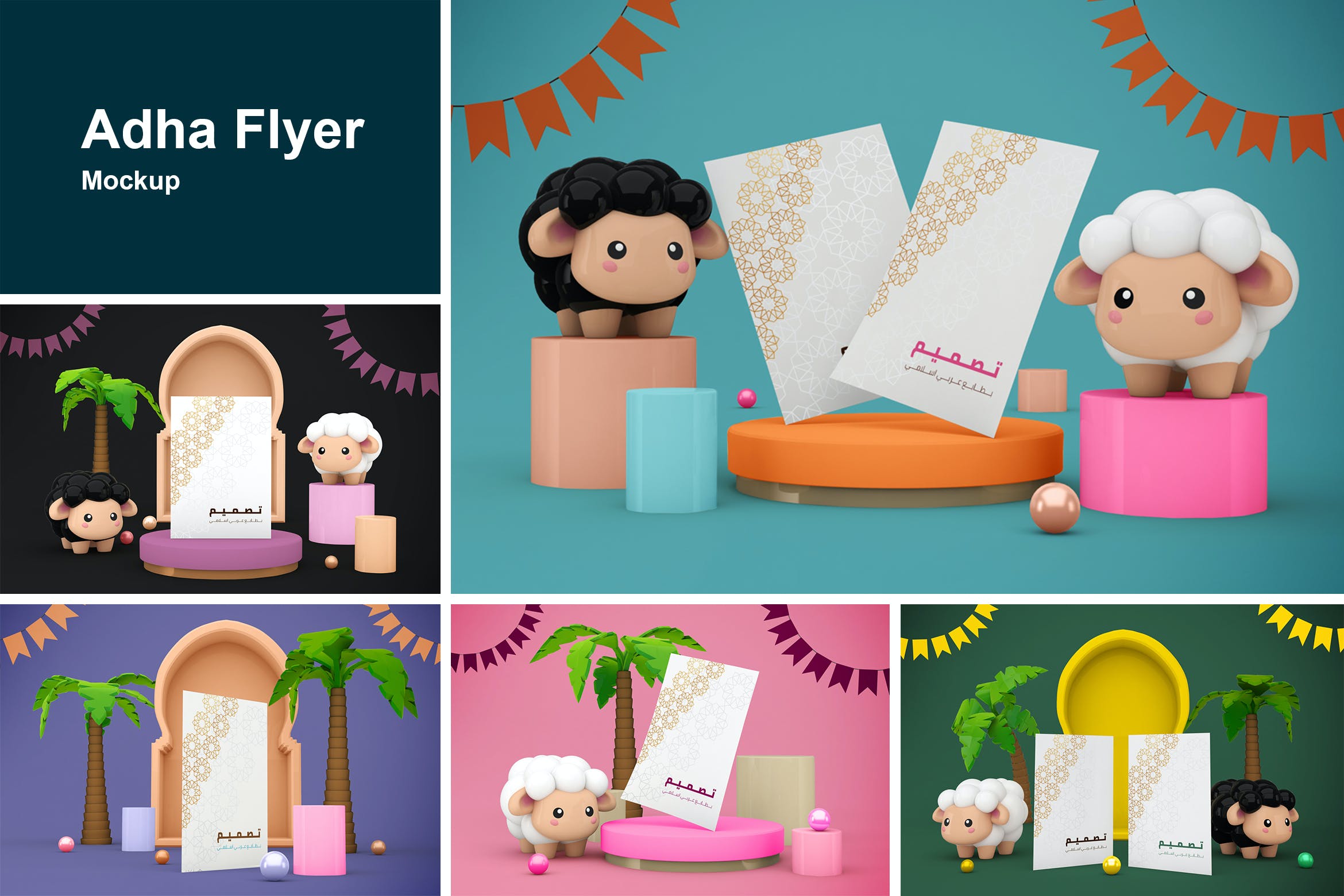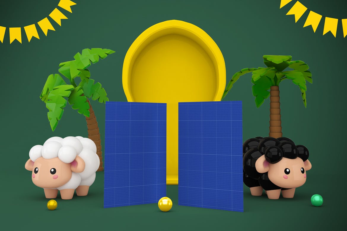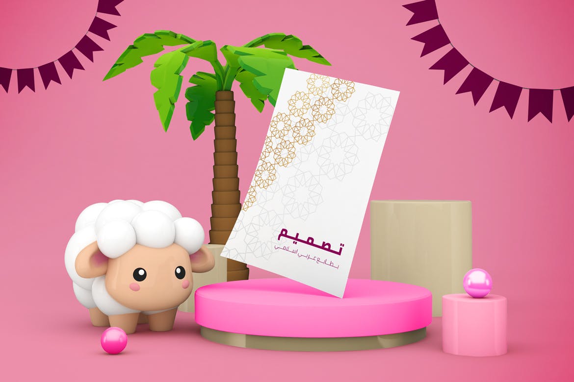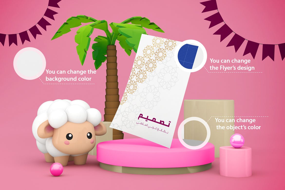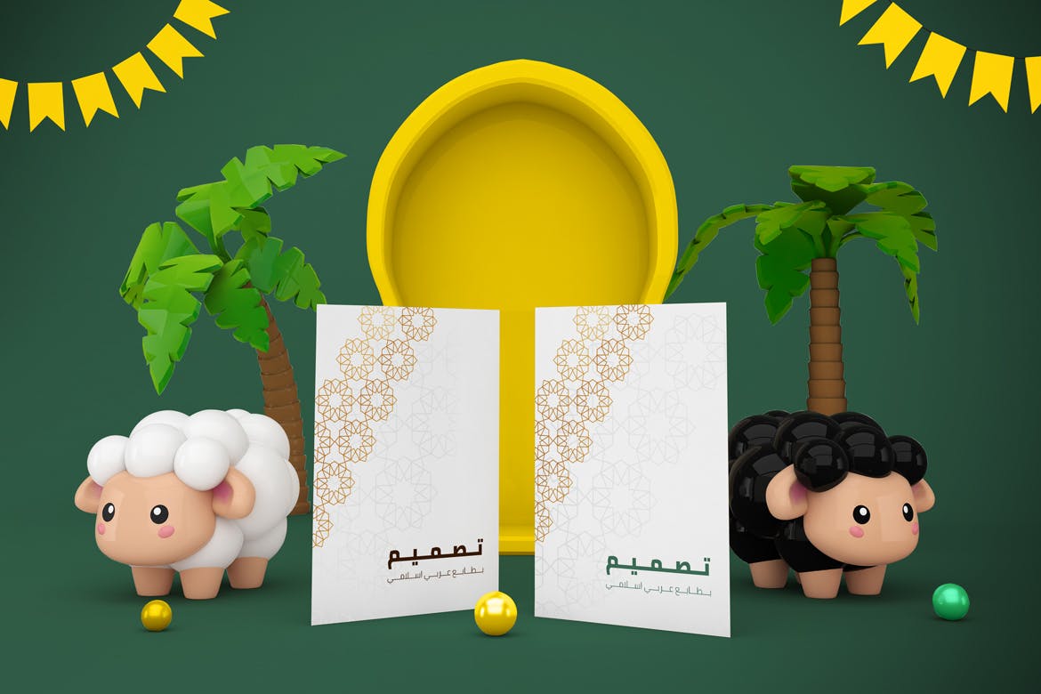 宰牲节主题场景传单纸张样机,可以从不同角度展示Eid主题背景中的传单,你可以将其用于你的设计,适合品牌展示,并由单独的图层集组成。高分辨率:4500×3000px,易于与智能对象一起使用,逼真的真实照片效果。