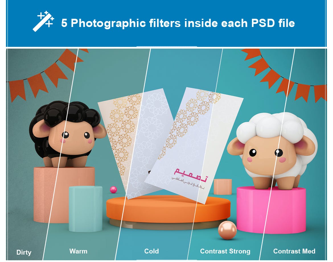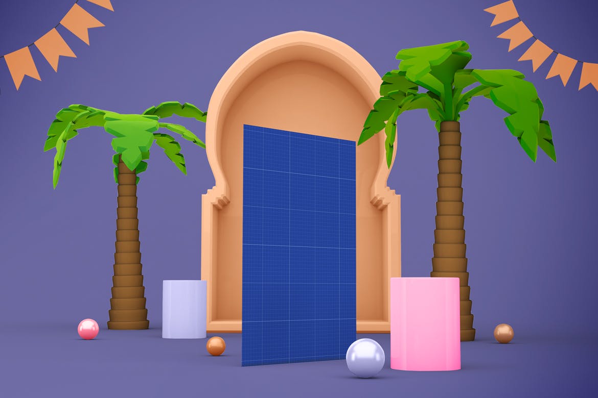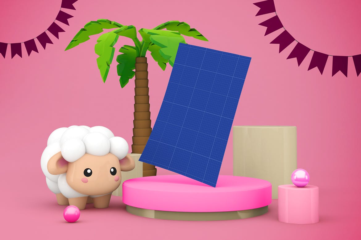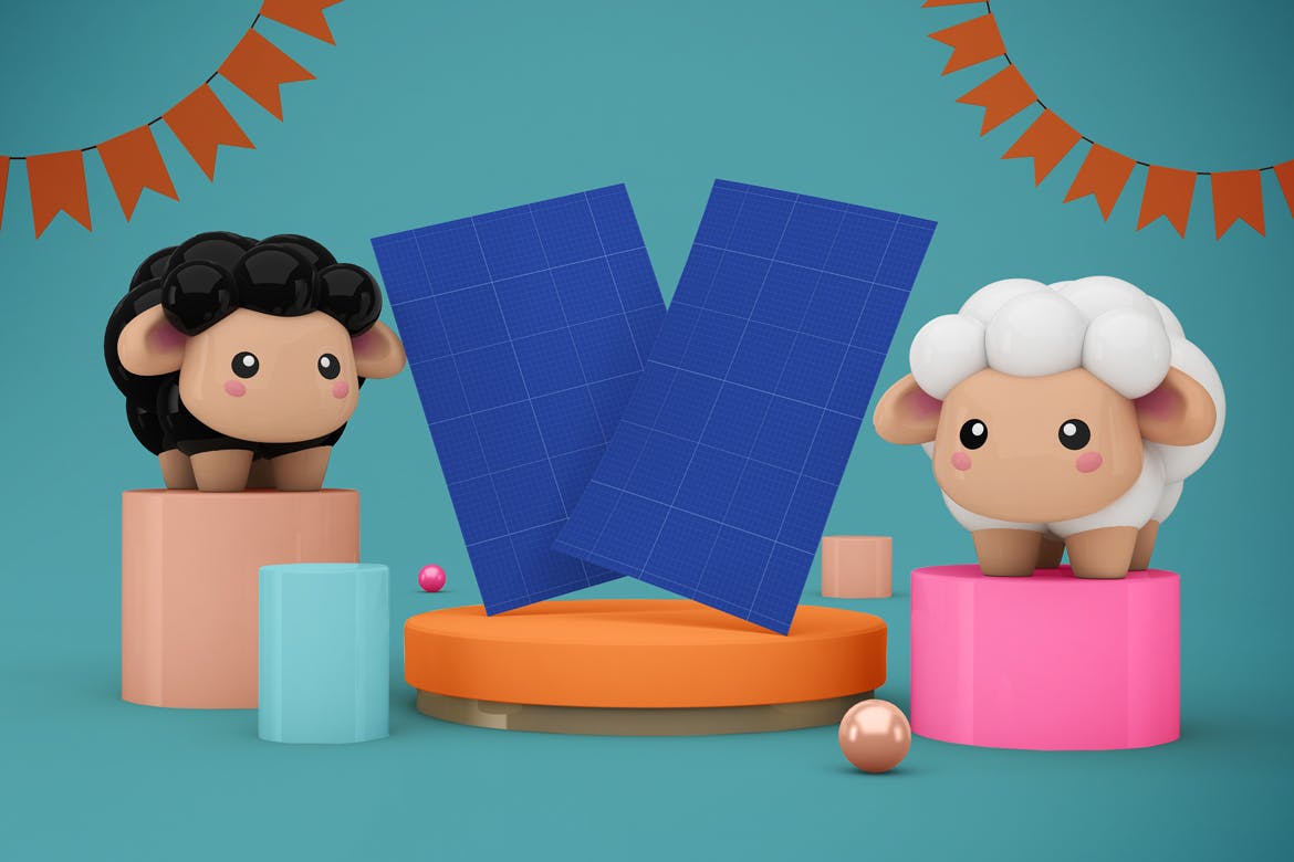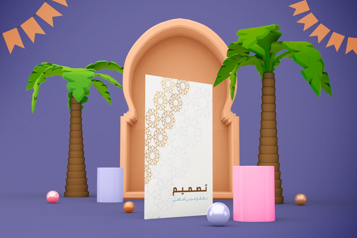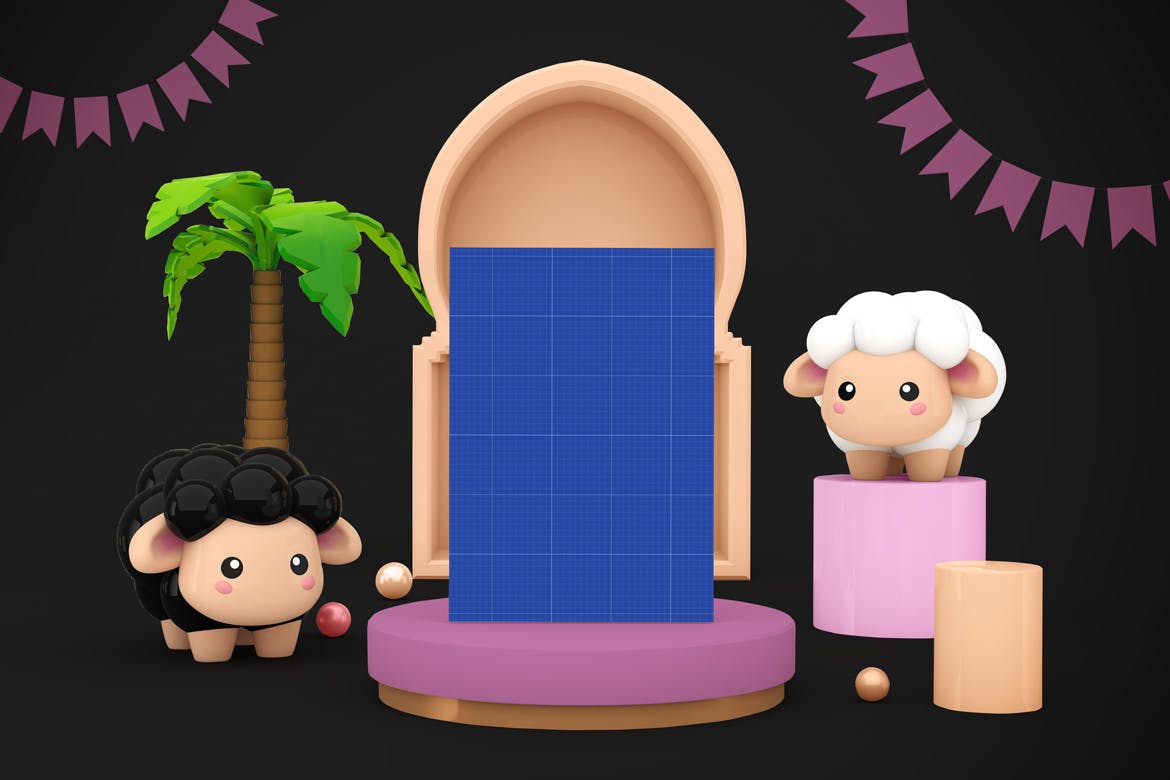 宰牲节主题场景传单纸张样机,可以从不同角度展示Eid主题背景中的传单,你可以将其用于你的设计,适合品牌展示,并由单独的图层集组成。高分辨率:4500×3000px,易于与智能对象一起使用,逼真的真实照片效果。