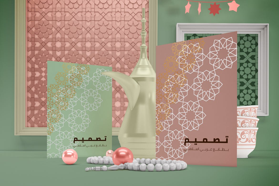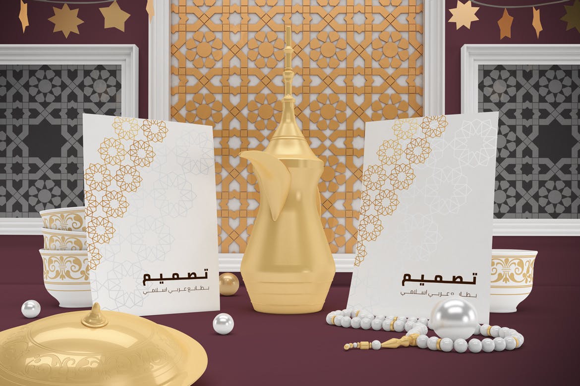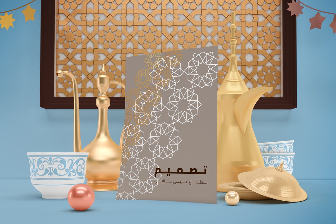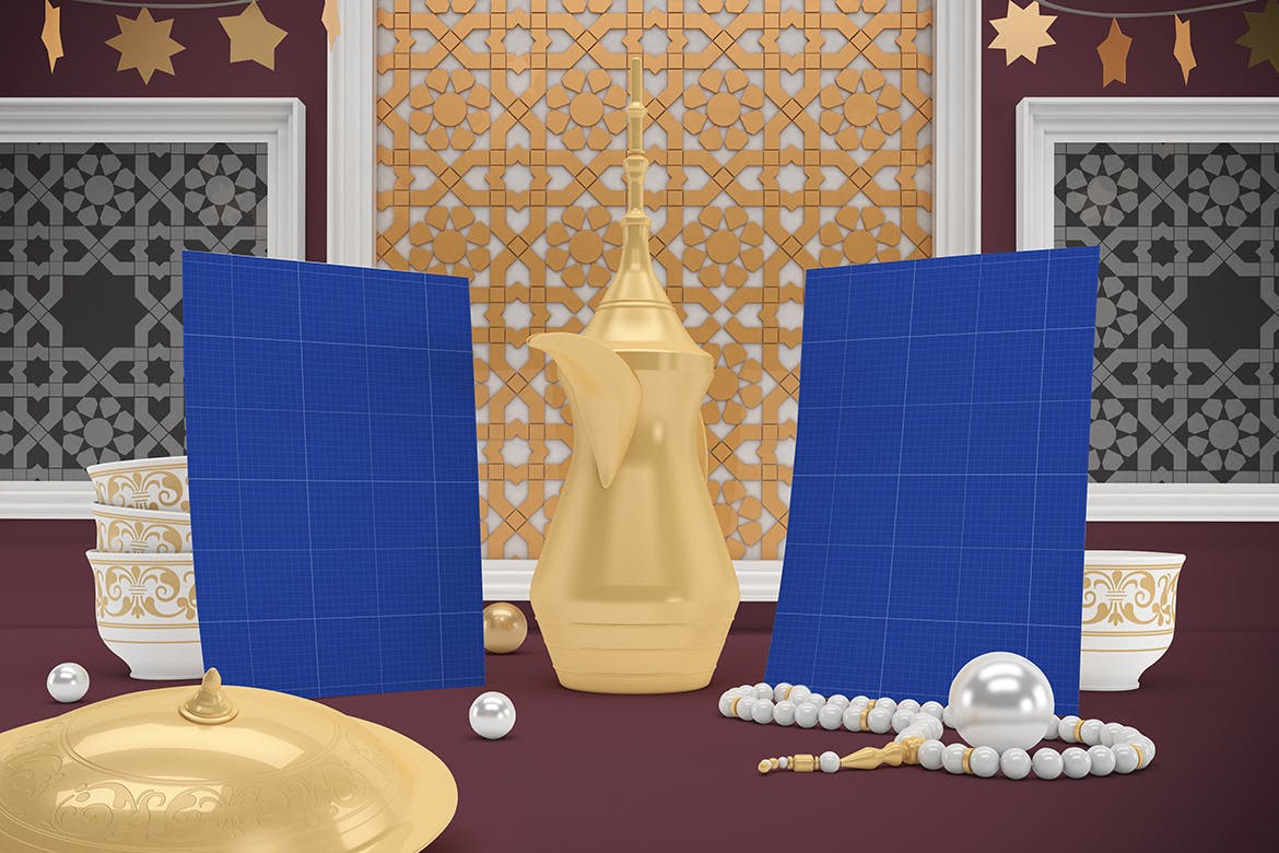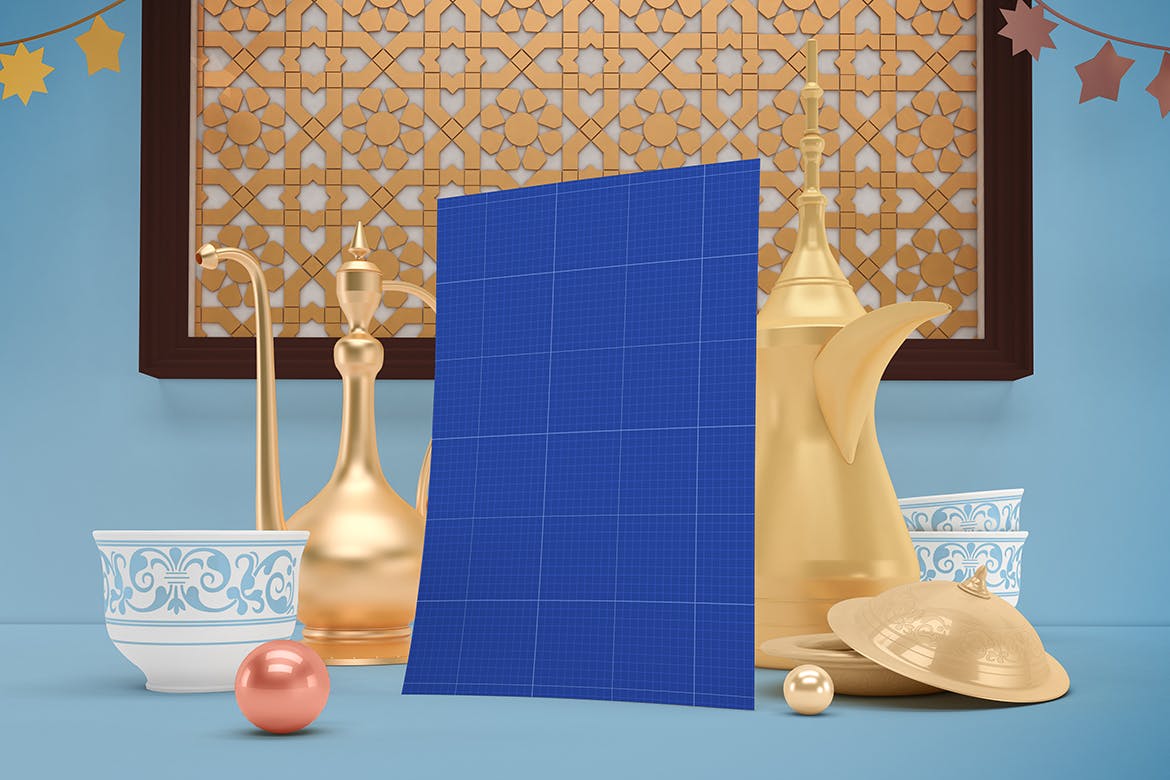 开斋节主题背景海报传单样机,可以从不同角度在Eid主题背景中呈现传单,你可以将其用于你的设计,适合品牌展示,并由单独的图层集组成。高分辨率:4500×3000px,易于与智能对象一起使用,逼真的真实照片效果。