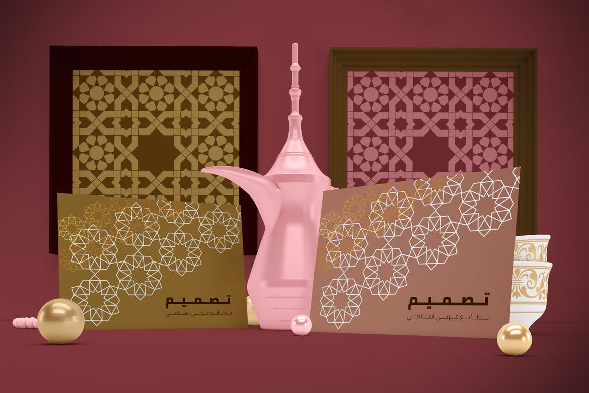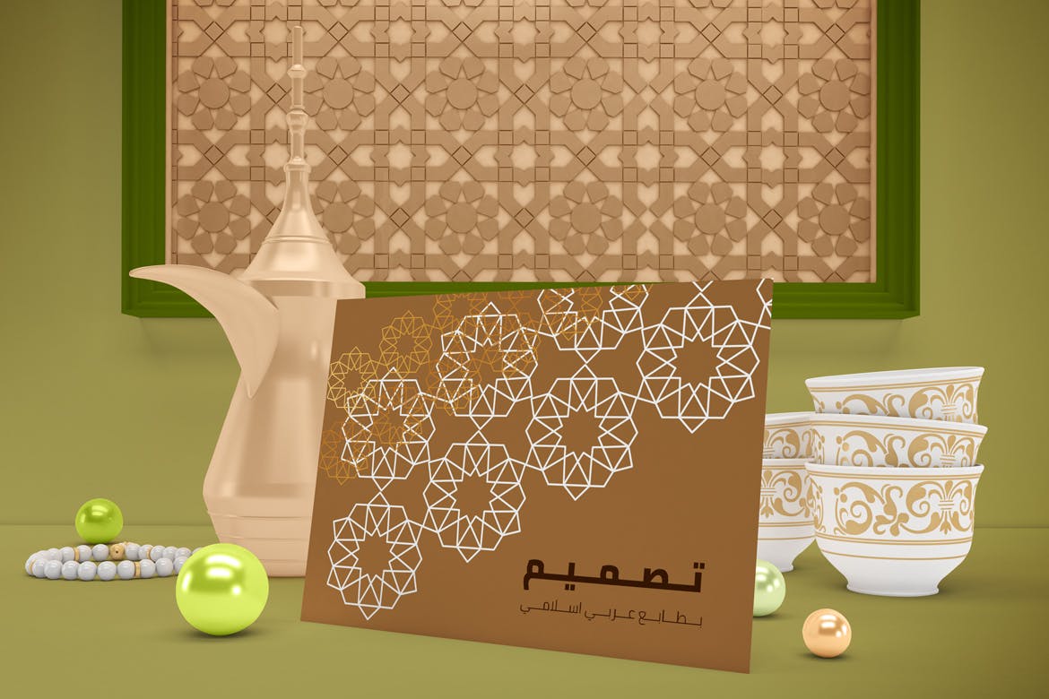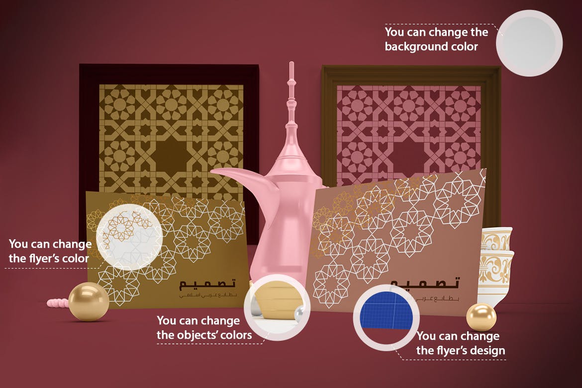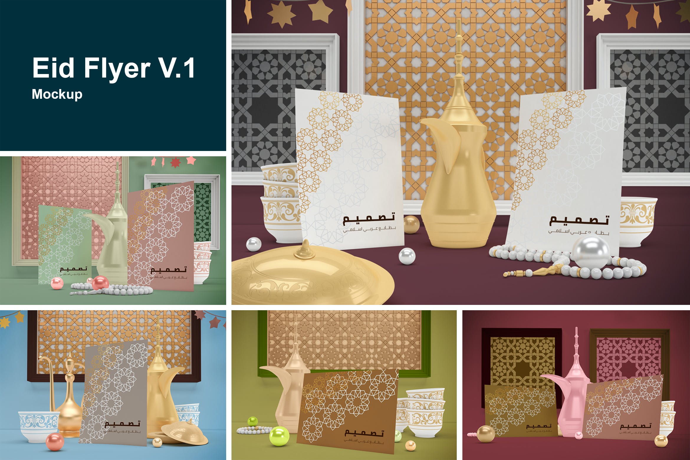 开斋节主题背景海报传单样机,可以从不同角度在Eid主题背景中呈现传单,你可以将其用于你的设计,适合品牌展示,并由单独的图层集组成。高分辨率:4500×3000px,易于与智能对象一起使用,逼真的真实照片效果。