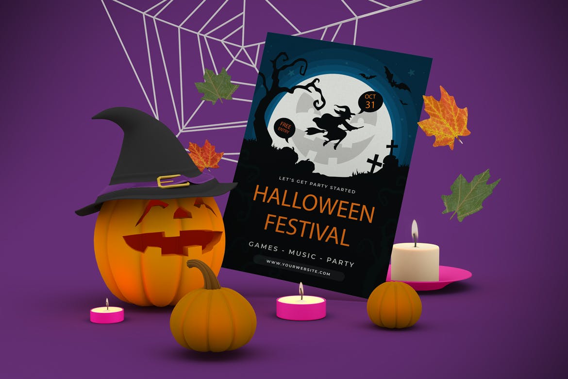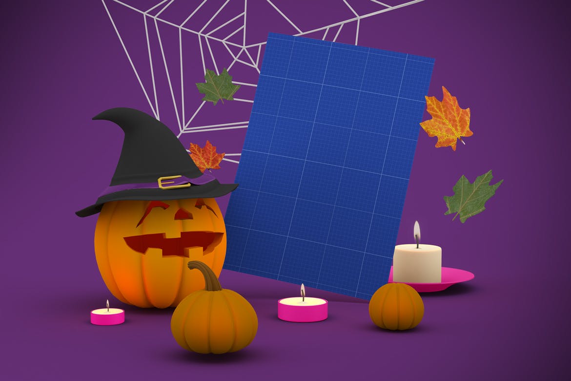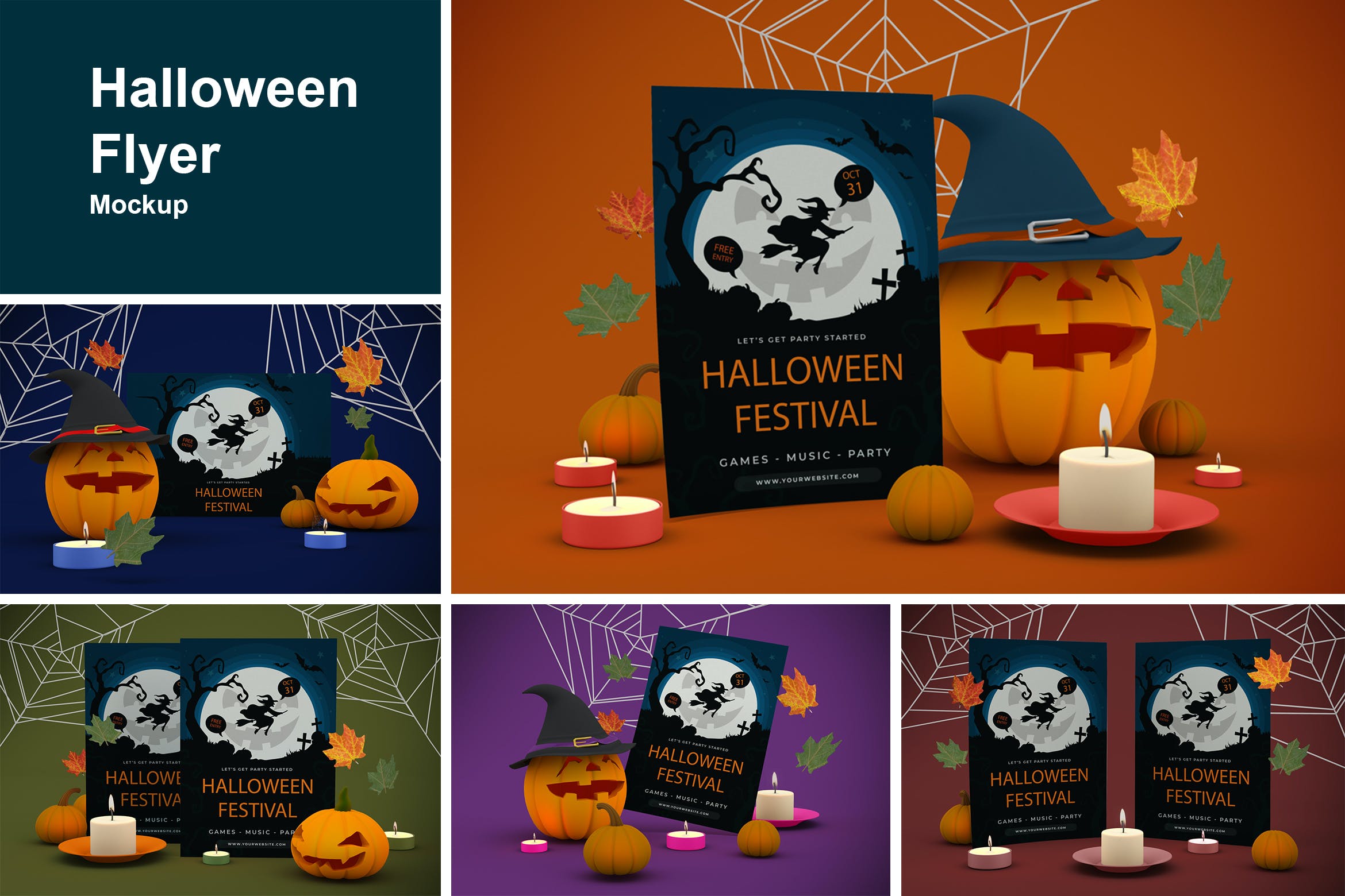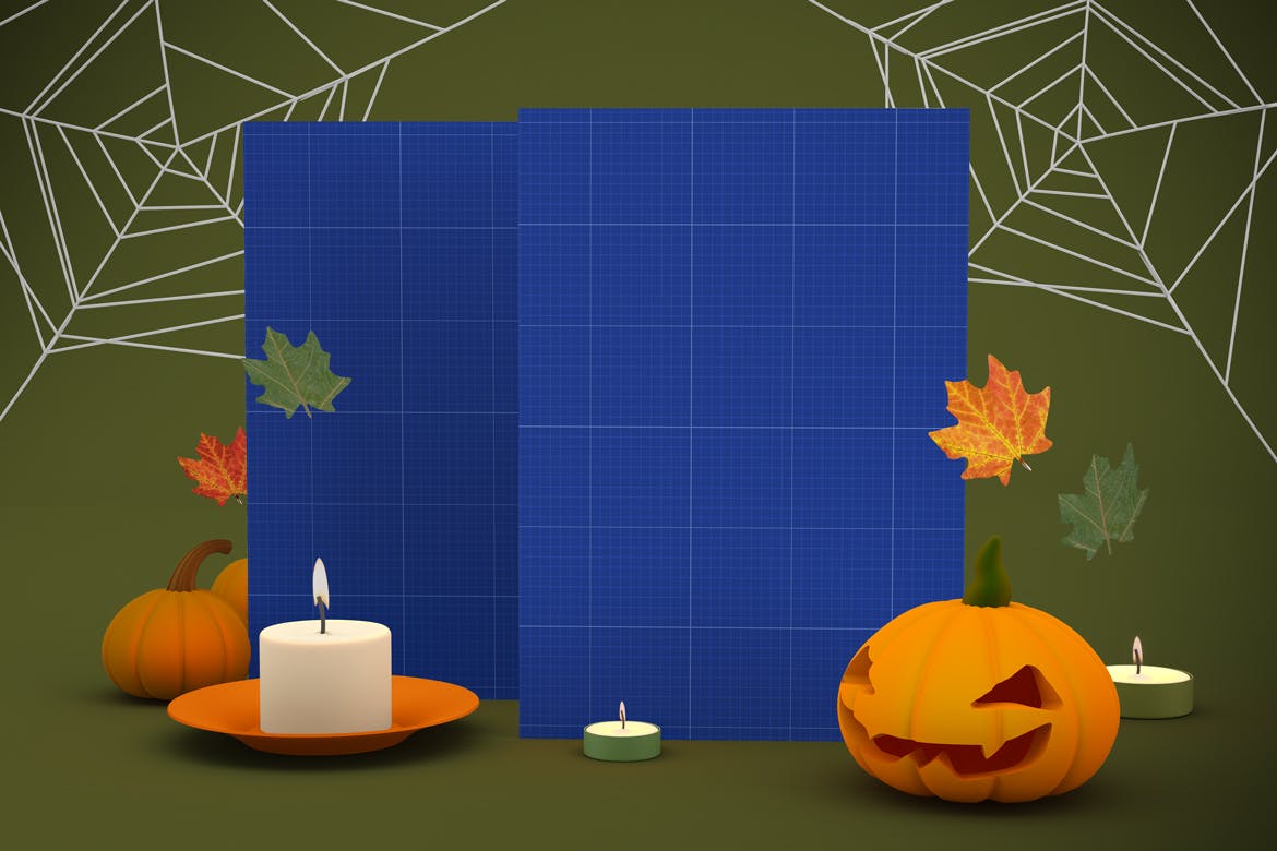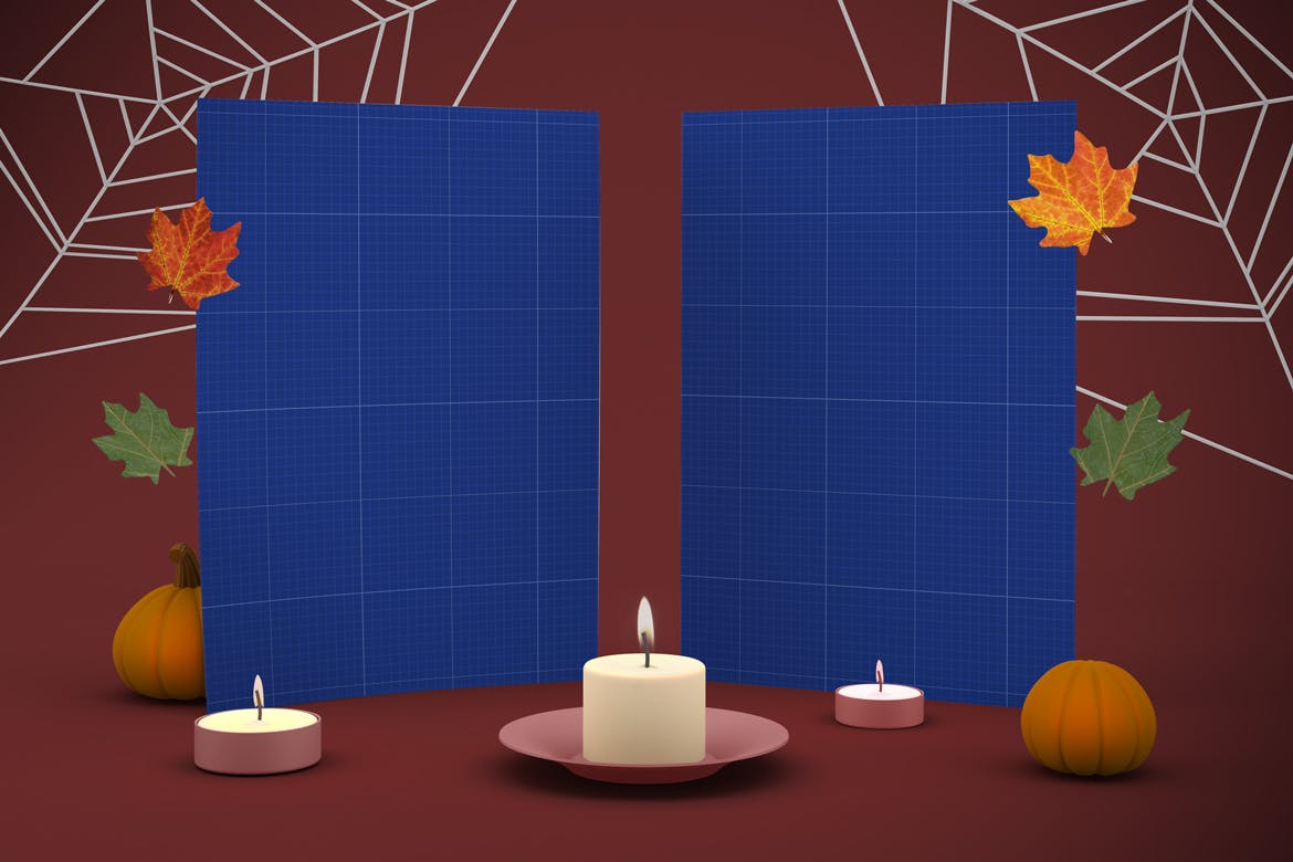 万圣节传单样机,可以在万圣节主题的背景下,从不同的角度展示传单,可用于您的设计,适合品牌,并由单独的图层集组成。高分辨率:4500×3000像素,易于与智能对象一起使用。