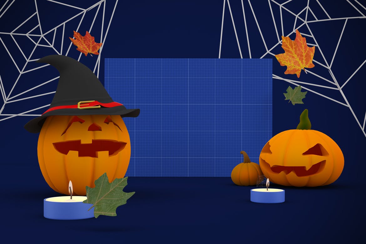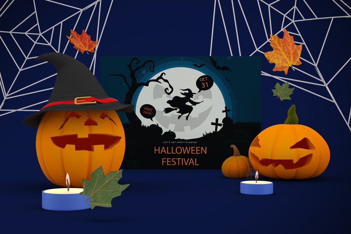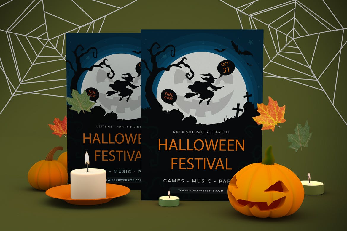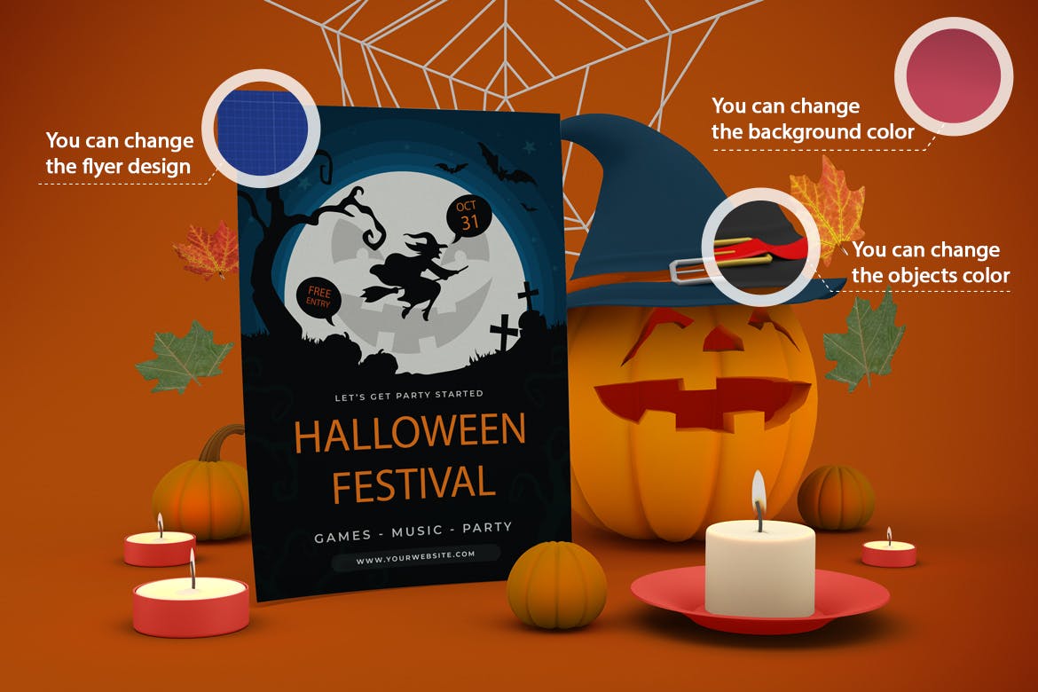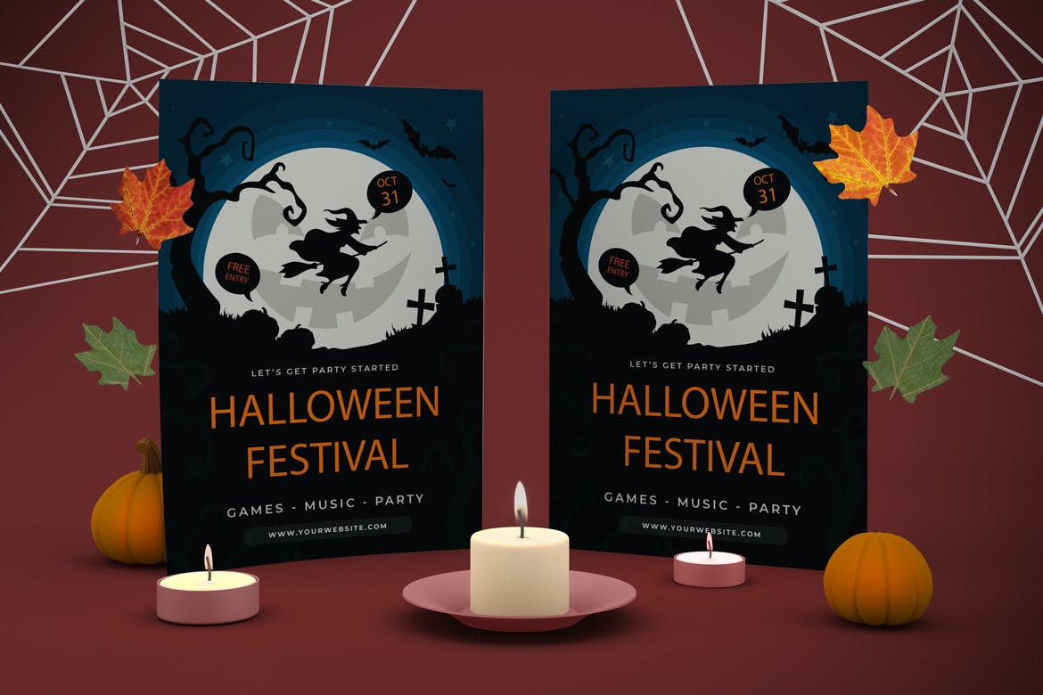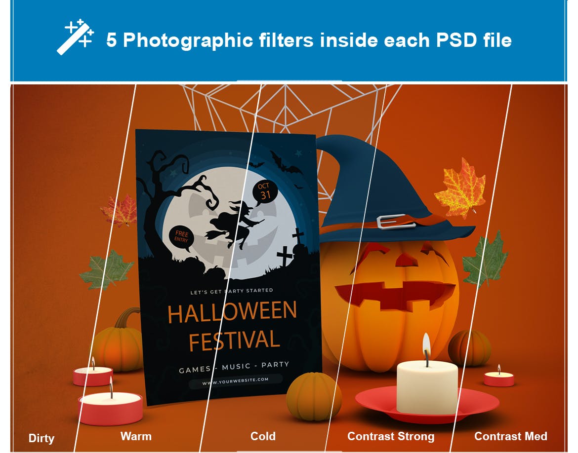 万圣节传单样机,可以在万圣节主题的背景下,从不同的角度展示传单,可用于您的设计,适合品牌,并由单独的图层集组成。高分辨率:4500×3000像素,易于与智能对象一起使用。