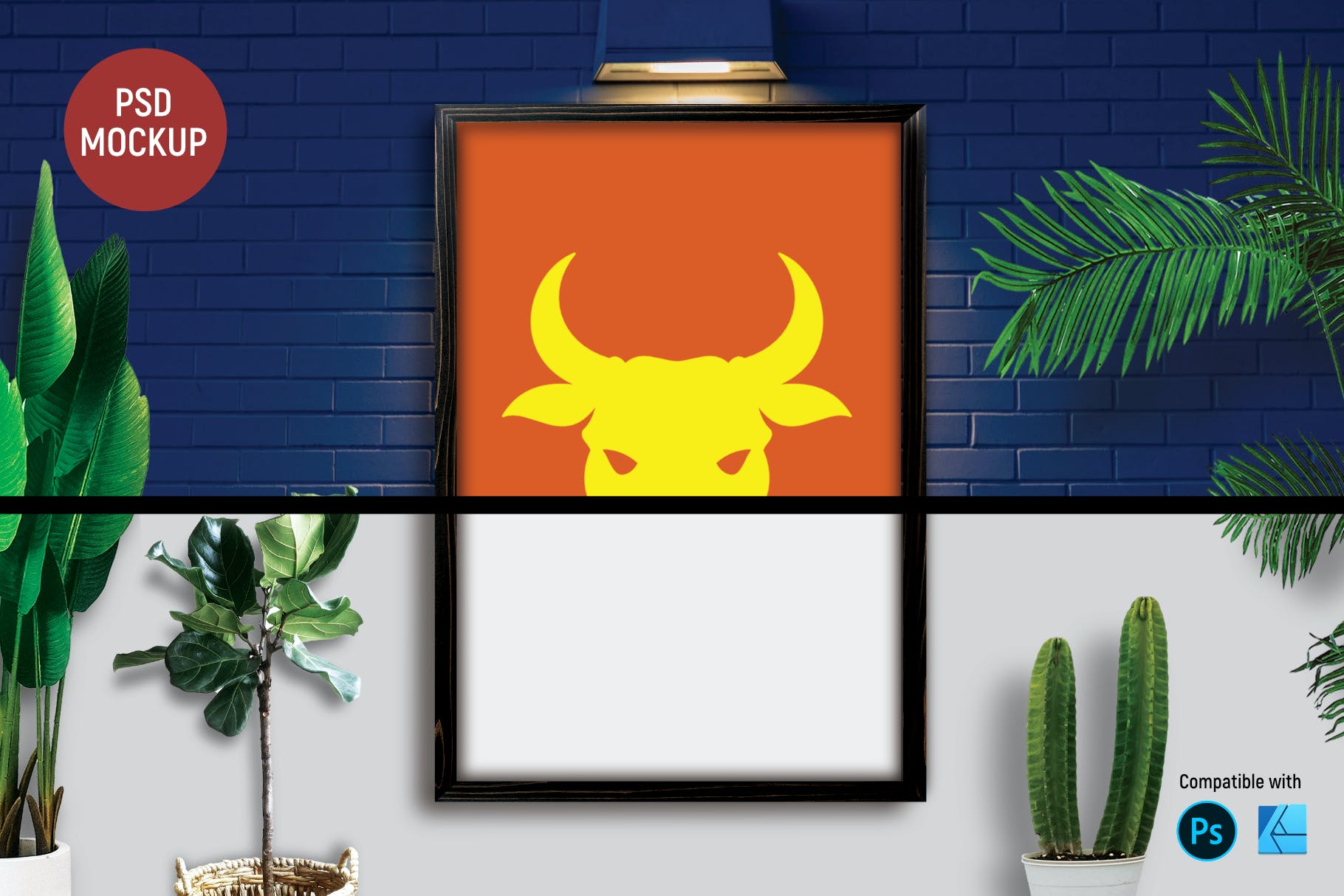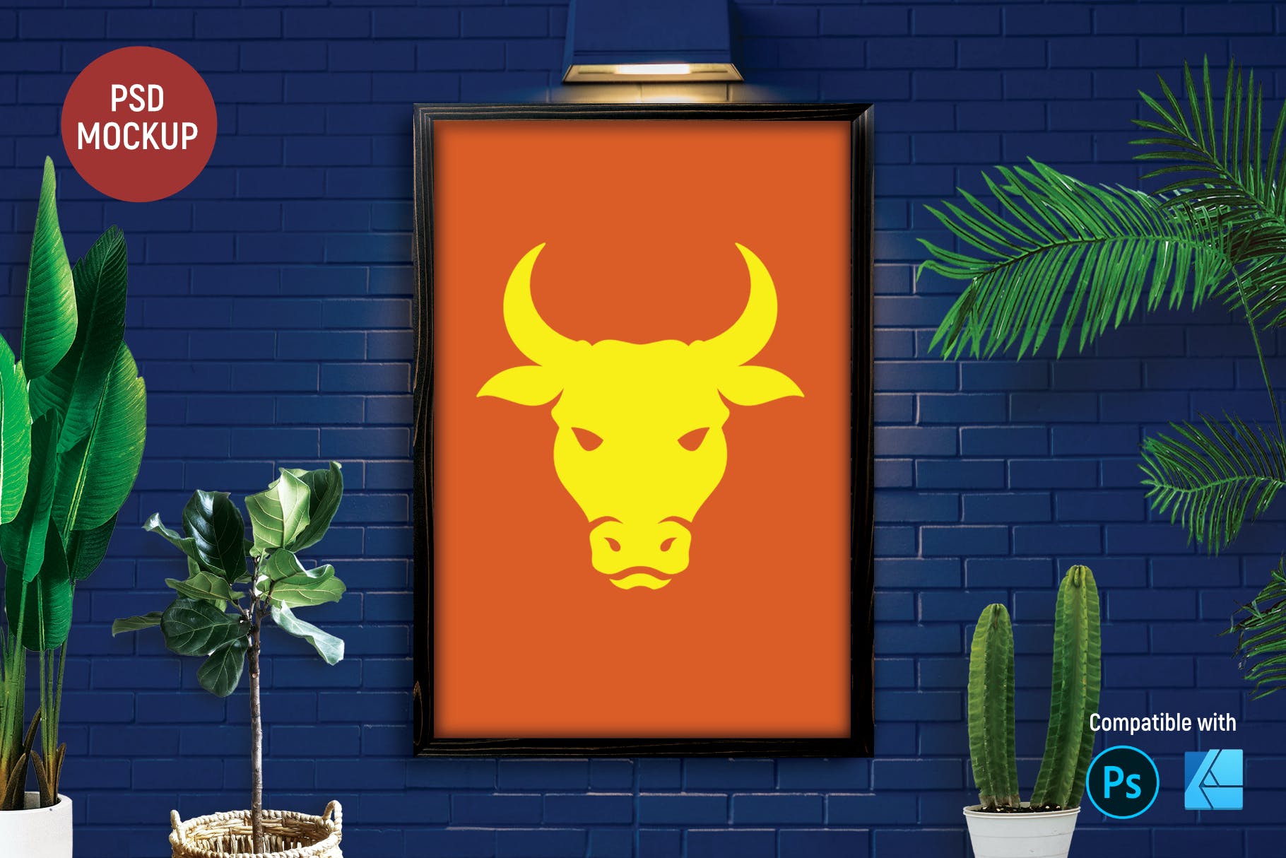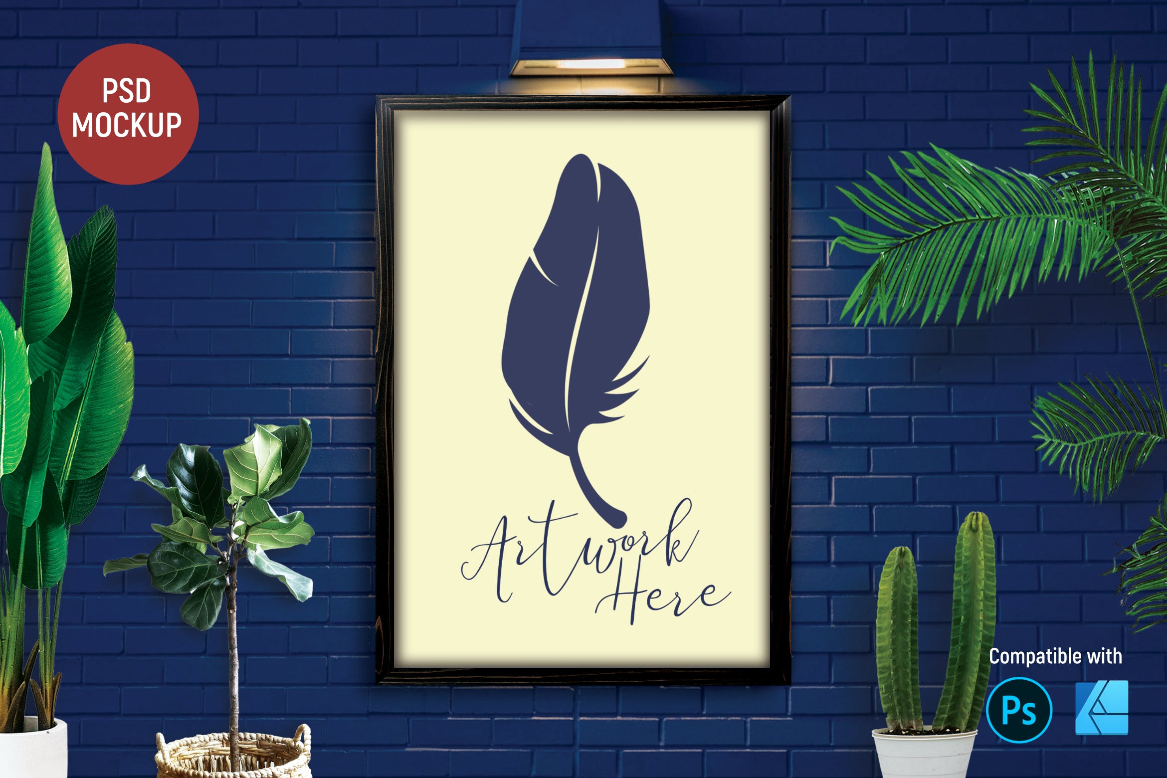 蓝色砖墙海报展示样机,兼容 Photoshop 和 Affinity Designer。尺寸 3000 x 2000 像素,高分辨率 300 dpi,不包括艺术品插图,仅用于演示目的。