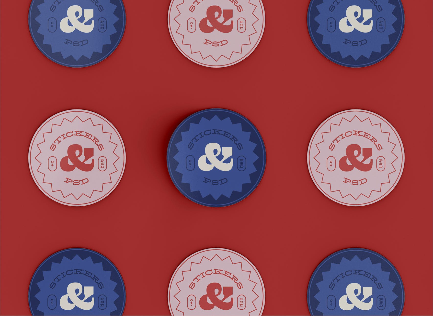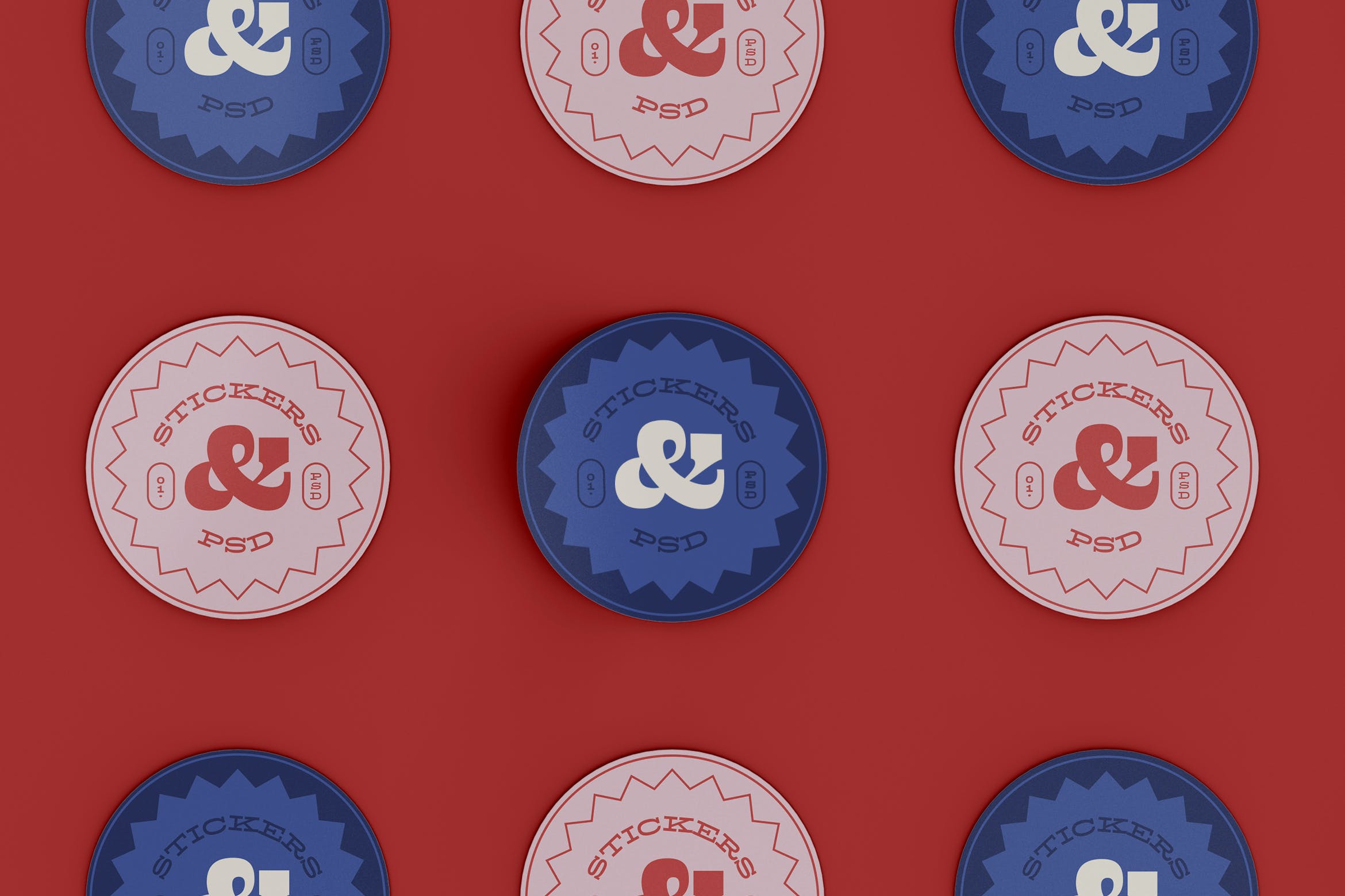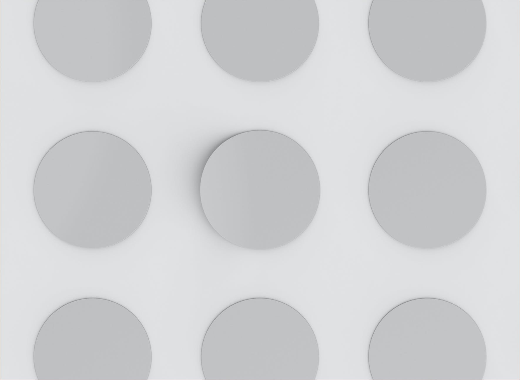 九个圆贴纸图案品牌设计样机,样机上有一个智能对象可帮助您调整设计。 只需拖放即可。 使用起来非常简单,使用纯色图层易于重新着色。高分辨率,300 dpi),示例样本设计不包含在下载文件中。