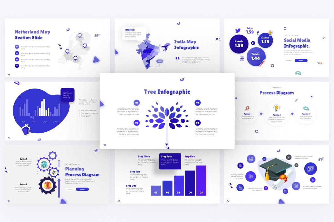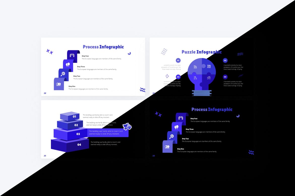 现在我们可以很容易地找到很多令人惊叹的演示模板。因此,我们需要改变我们的思维方式,不仅仅是为了展示完美的幻灯片,而是为了提升其中的体验。在这里,我们向您展示了一个信息图表包,用于在业务发展的每个阶段伴随整体品牌接触点,从开始一个新项目,在竞争对手中建立认可,到以改进的目标主张结束。