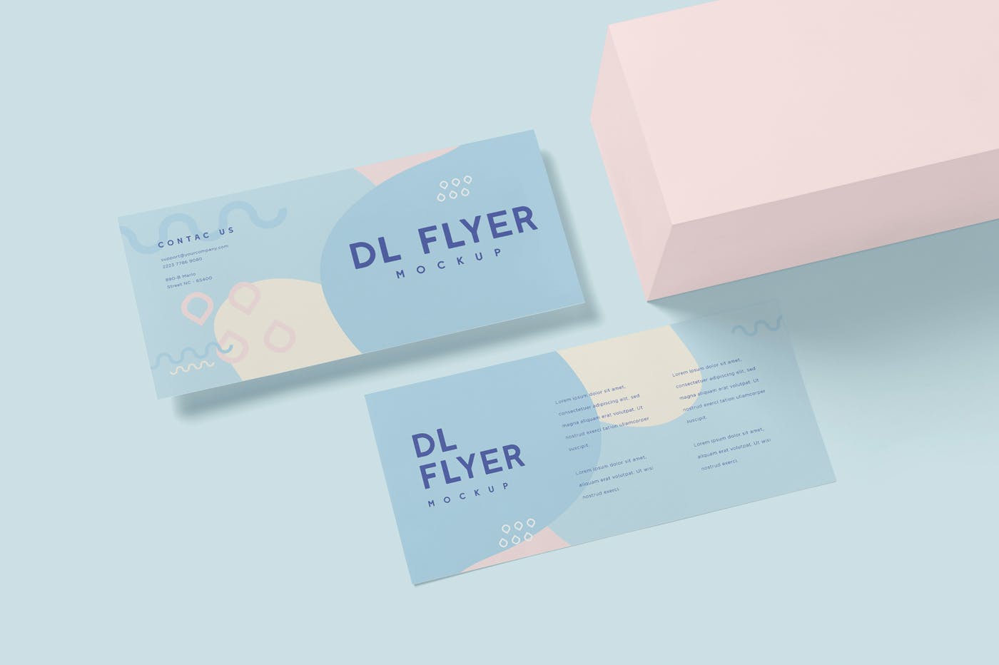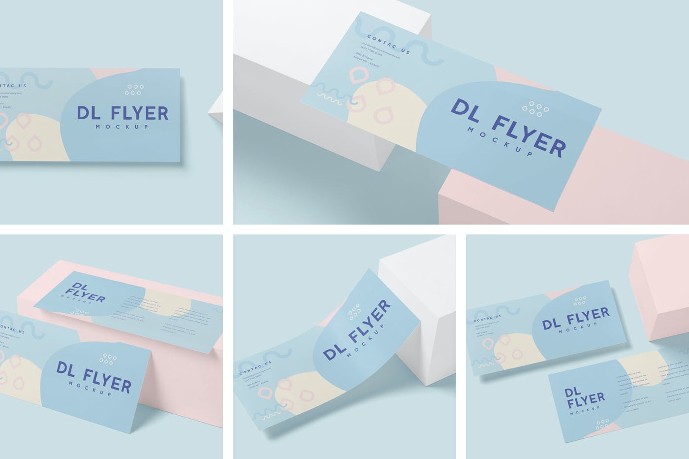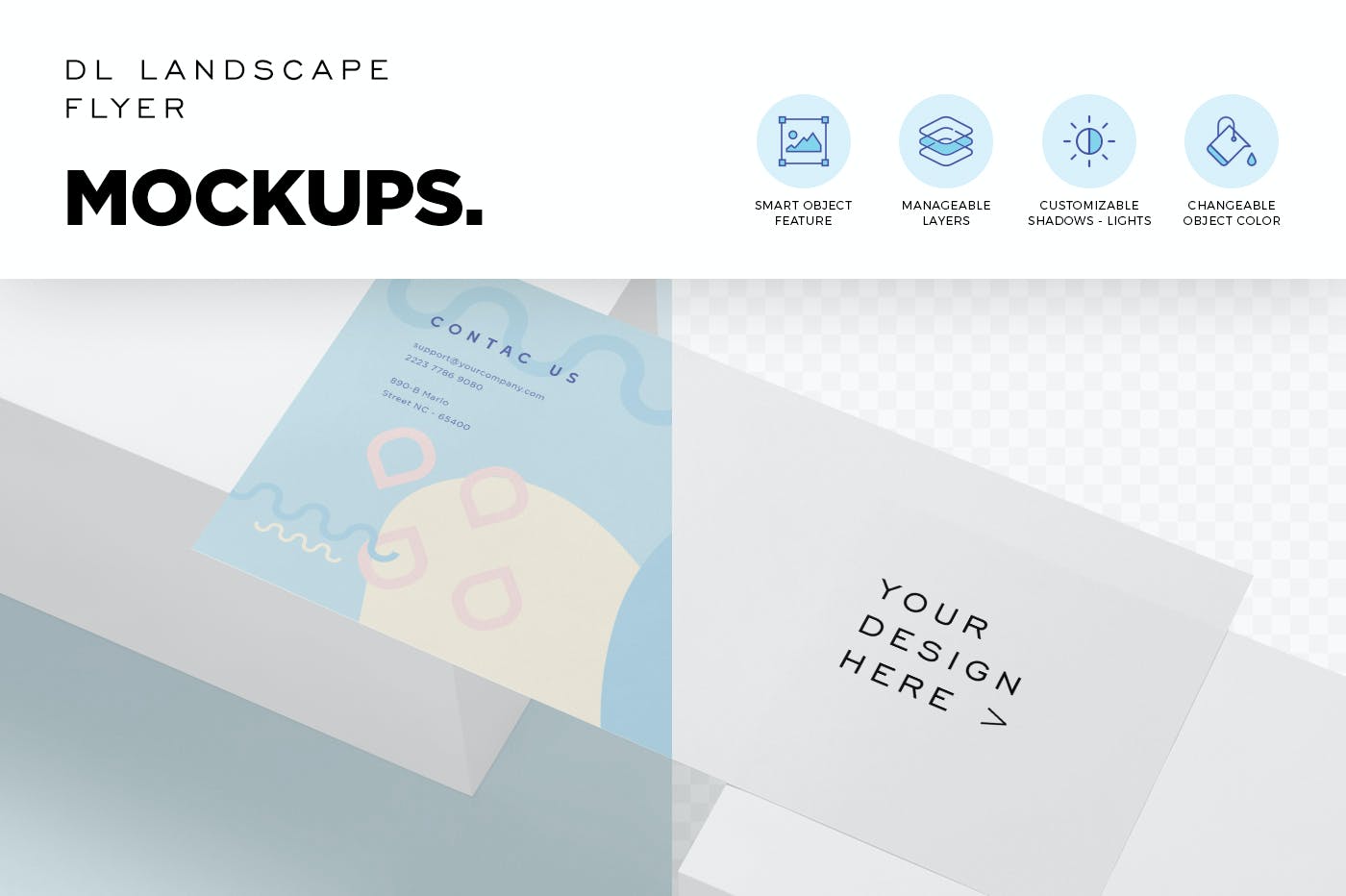 尝试使用这些 DL传单样机来展示您的促销、服务、指南和印刷广告设计。 您只需使用其详细描述的图层和智能对象选项即可更改设计、颜色、阴影、效果和背景。