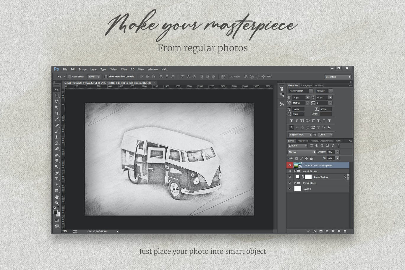 这次老不湿分享的是,逼真质感的手绘铅笔素描效果图层样式,用铅笔绘制您的照片 只需几秒钟即可获得铅笔绘制的逼真的效果。通过智能对象替换易于使用的模板。用铅笔笔触在纸张纹理上的创意艺术。从您的照片中获取水彩艺术!