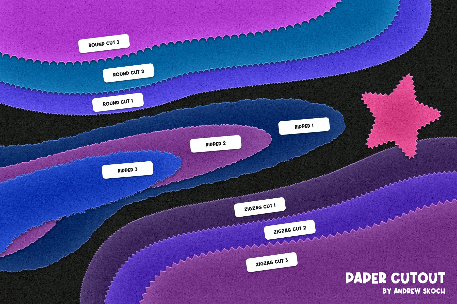 特效剪纸字体样式,用这9个动作创建一个撕裂边或切边。瞬间应用图层样式,所以你可以很容易地选择你需要的颜色。