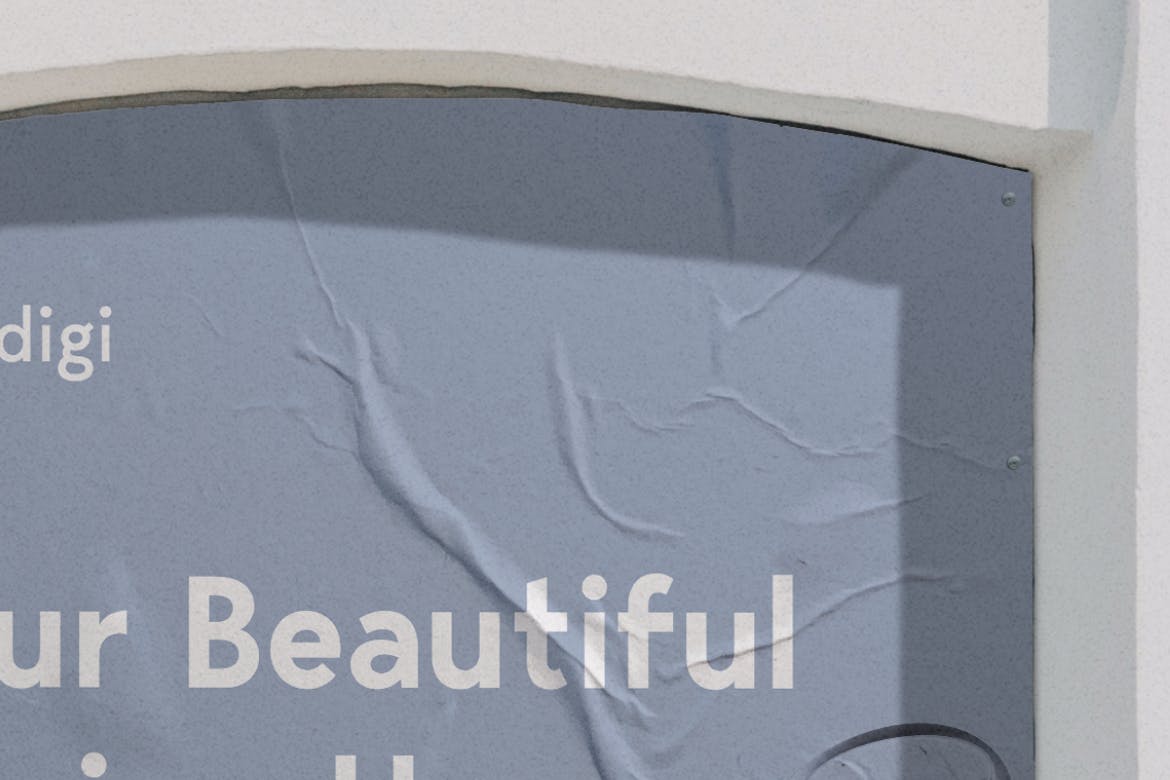 街道场景胶合海报展示样机,智能对象图层(只需双击图层、放置设计并保存),高分辨率 6000x4000px,300 dpi,所有对象和阴影单独分开,所有样机和物品都可以移动创建自己独特的场景。