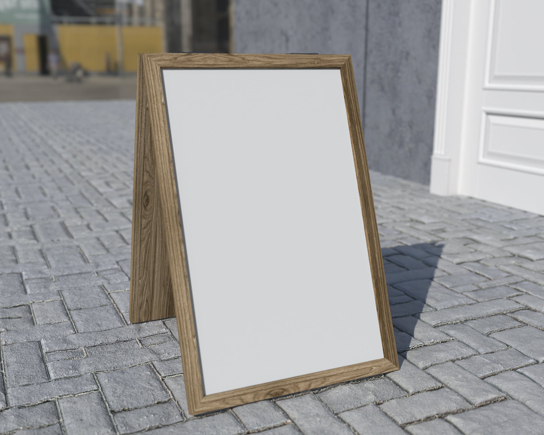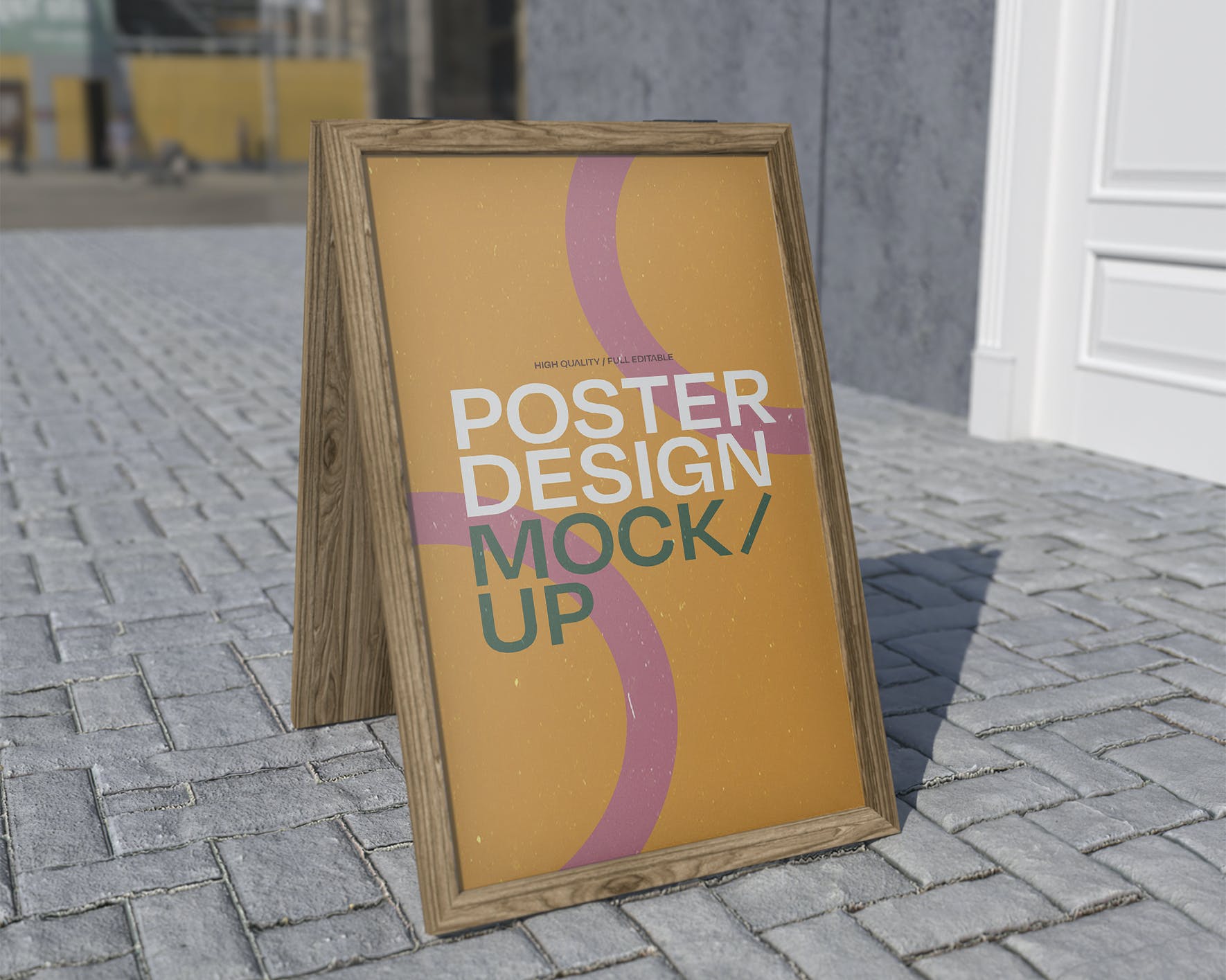 A字形木框架海报展示样机,有一个智能对象可帮助您调整设计,只需拖放即可。使用起来非常简单,以完美的方式展示您的作品,如传单、海报、文具和其他设计。高分辨率 (300 dpi), 使用纯色图层易于重新着色。示例样本设计不包含在下载文件中。