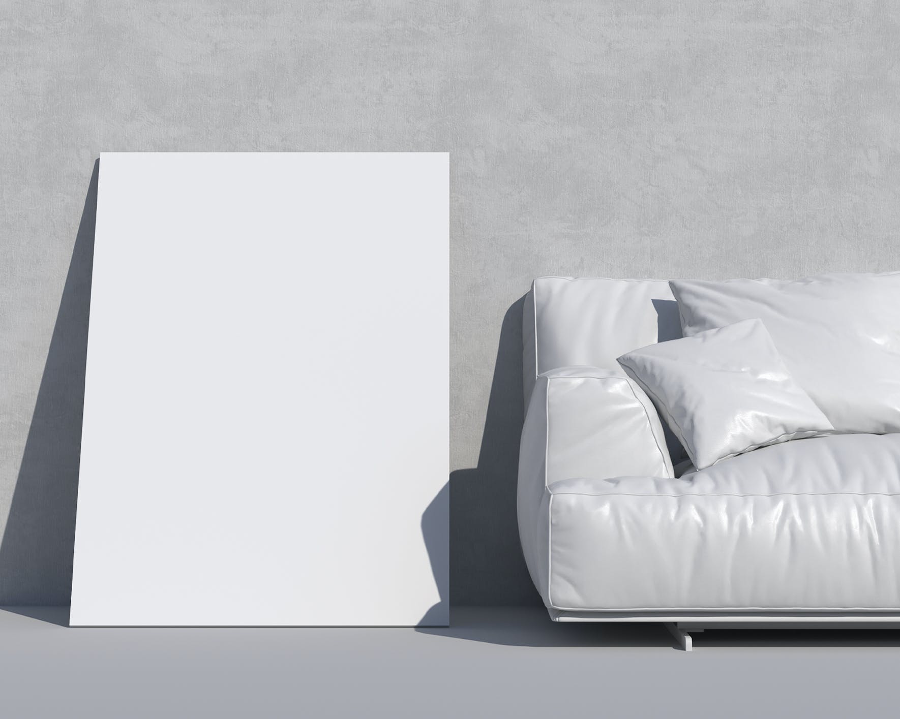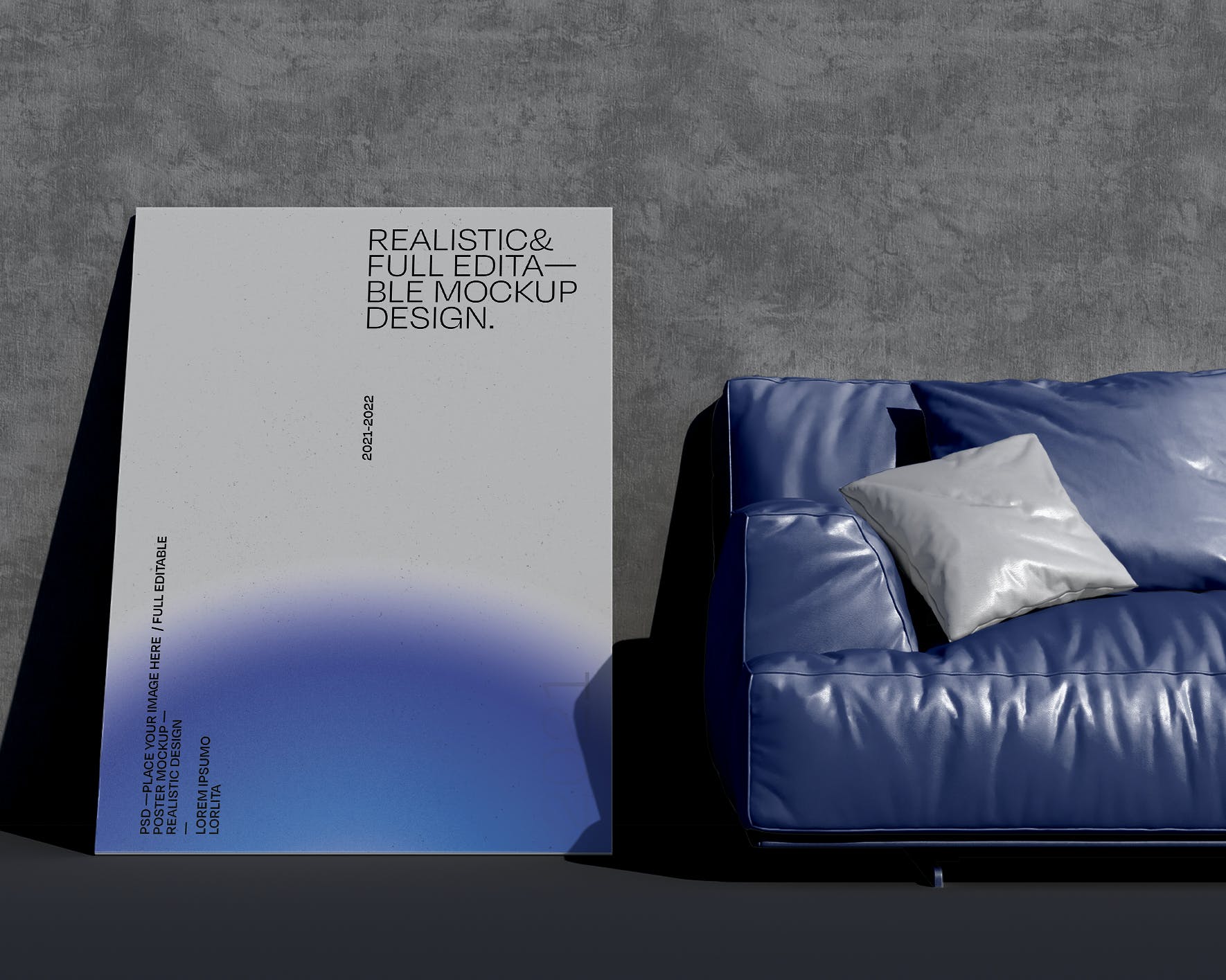沙发石墙背景海报作品展示样机,有一个智能对象可帮助您调整设计,只需拖放即可。使用起来非常简单,以完美的方式展示您的作品,如传单、海报、文具和其他设计。高分辨率 (300 dpi), 使用纯色图层易于重新着色。示例样本设计不包含在下载文件中。