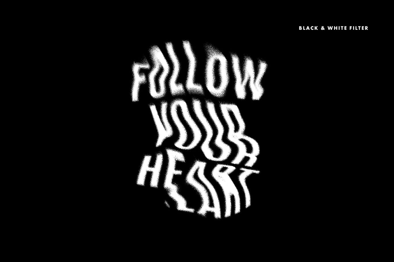 用您自己的字体写一些东西,以查看字符弯曲,驻留并彼此溶解,并散布着破碎的像素。您会在包装盒中找到黑白滤镜及其倒置版本,以了解自己更喜欢哪一面。此外,像素的颜色也可以关闭。