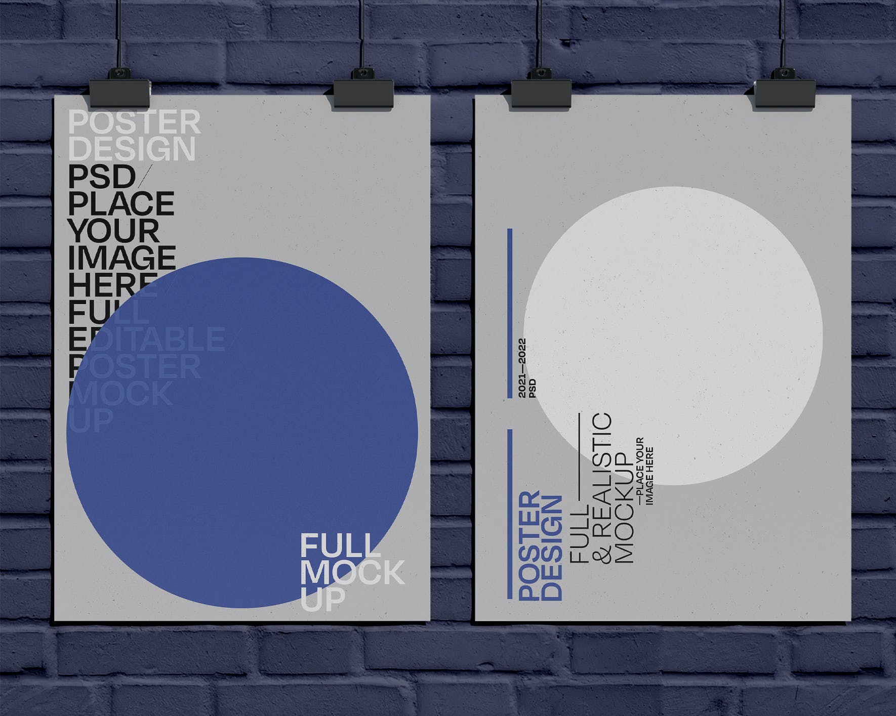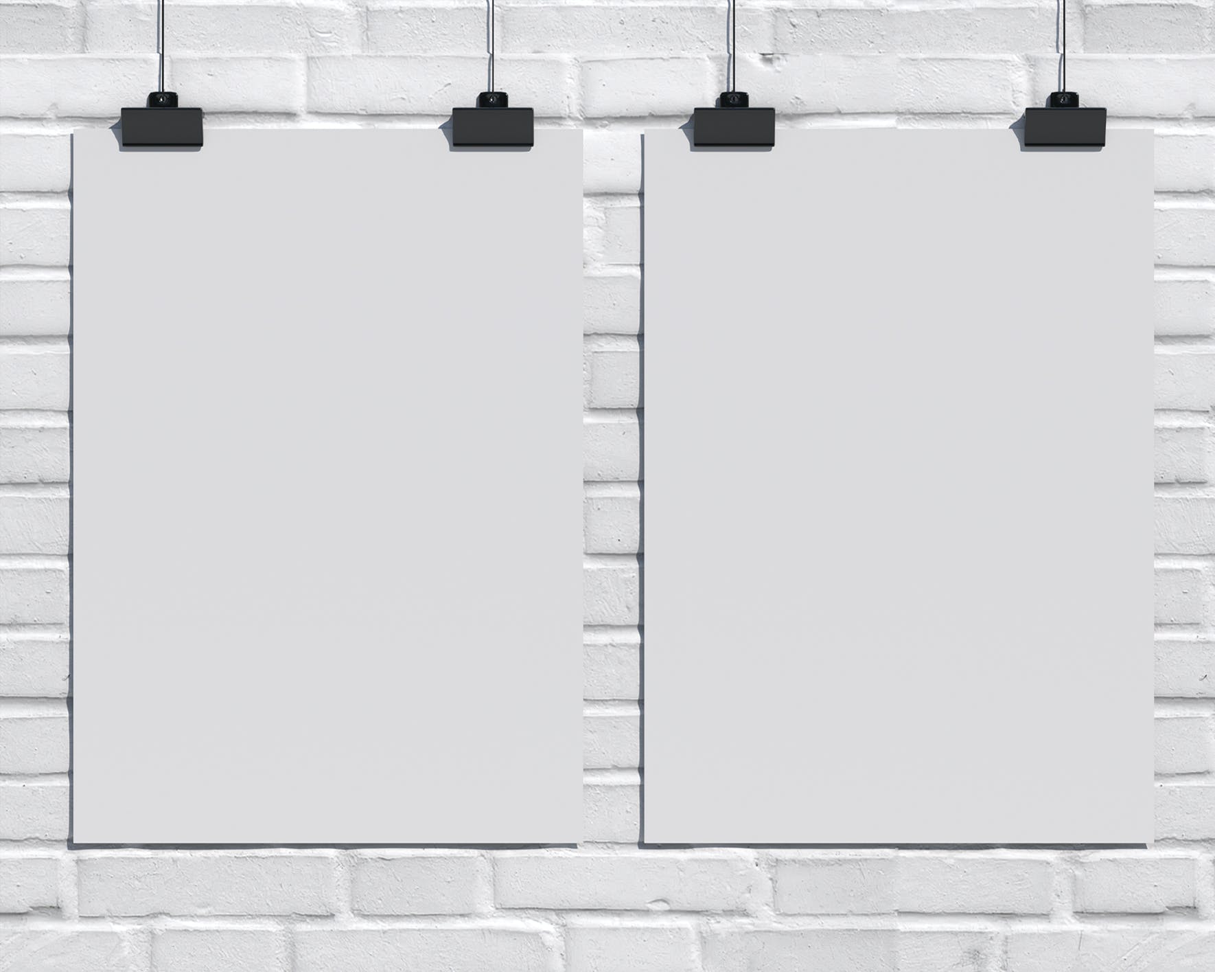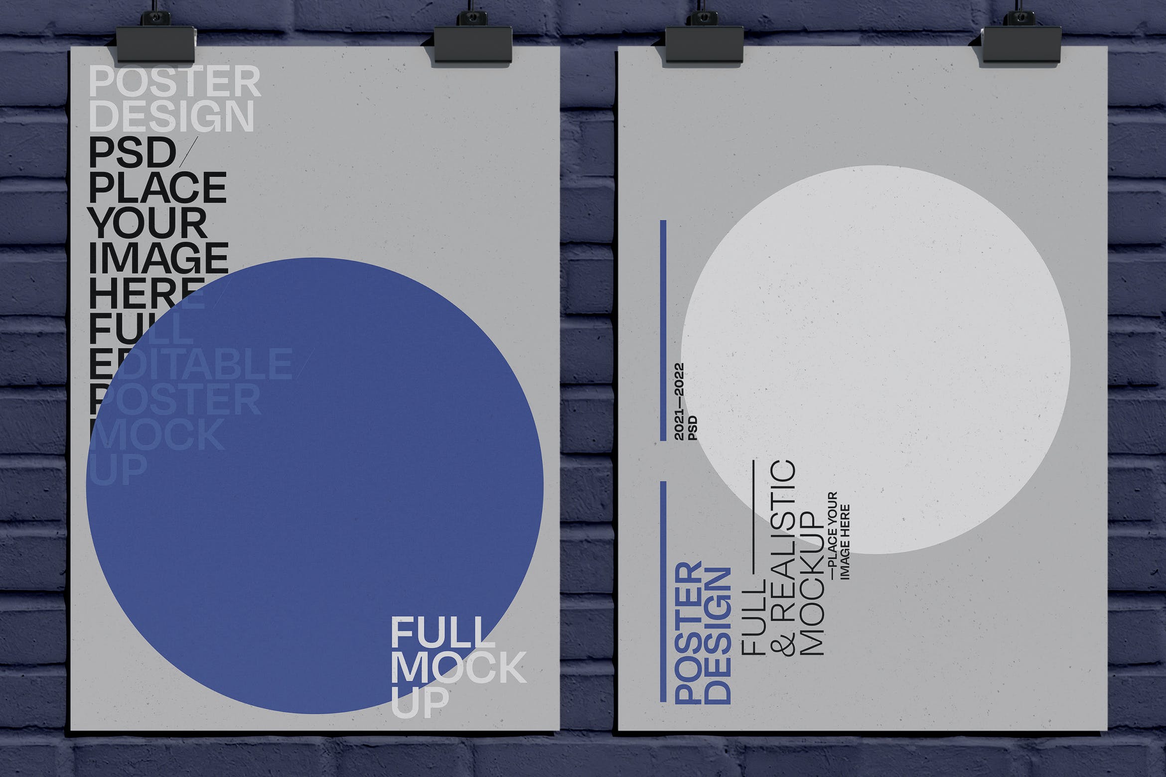 两个吊挂海报作品展示样机,有一个智能对象可帮助您调整设计,只需拖放即可。使用起来非常简单,以完美的方式展示您的作品,如传单、海报、文具和其他设计。高分辨率 (300 dpi), 使用纯色图层易于重新着色。示例样本设计不包含在下载文件中。