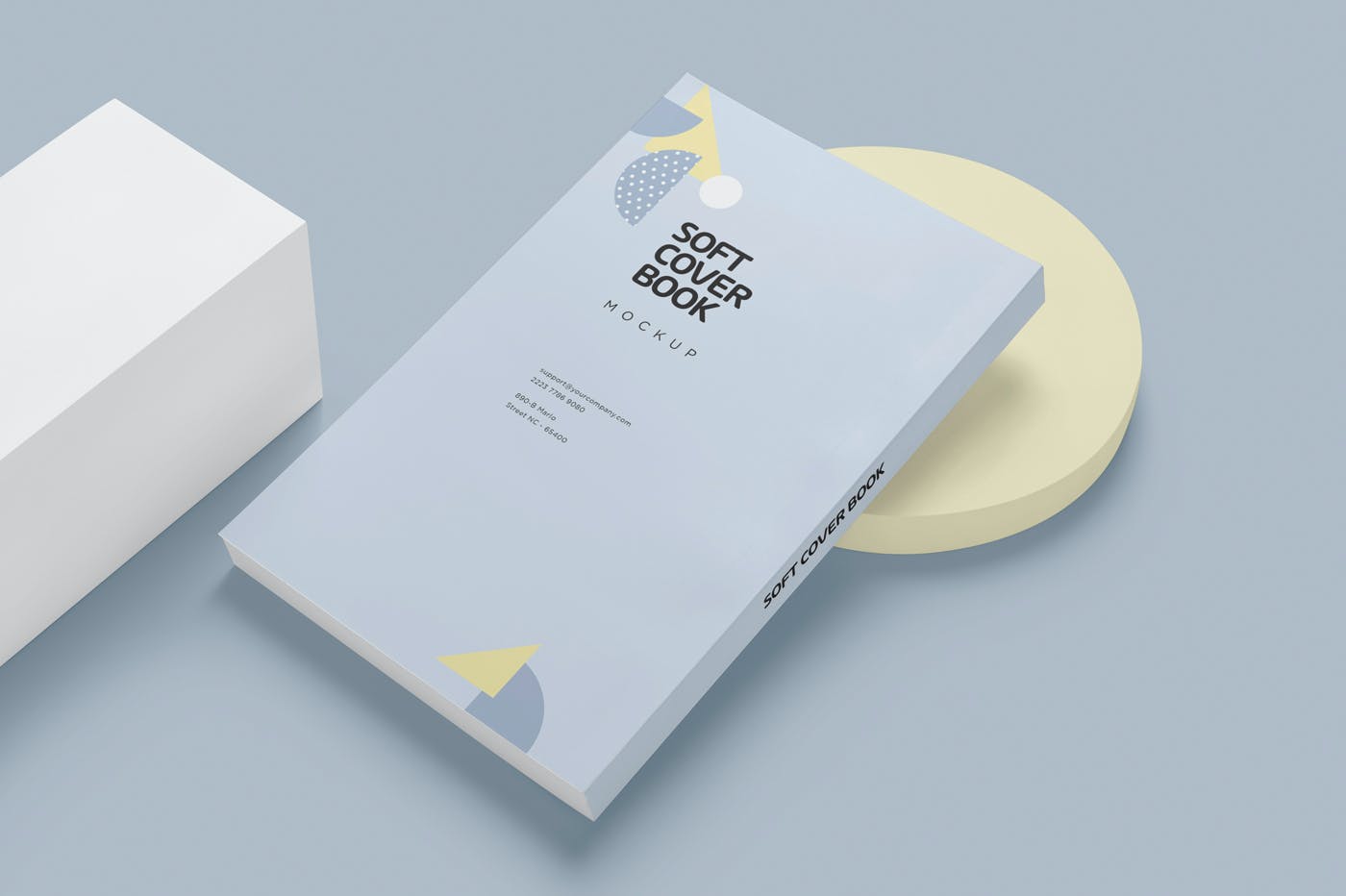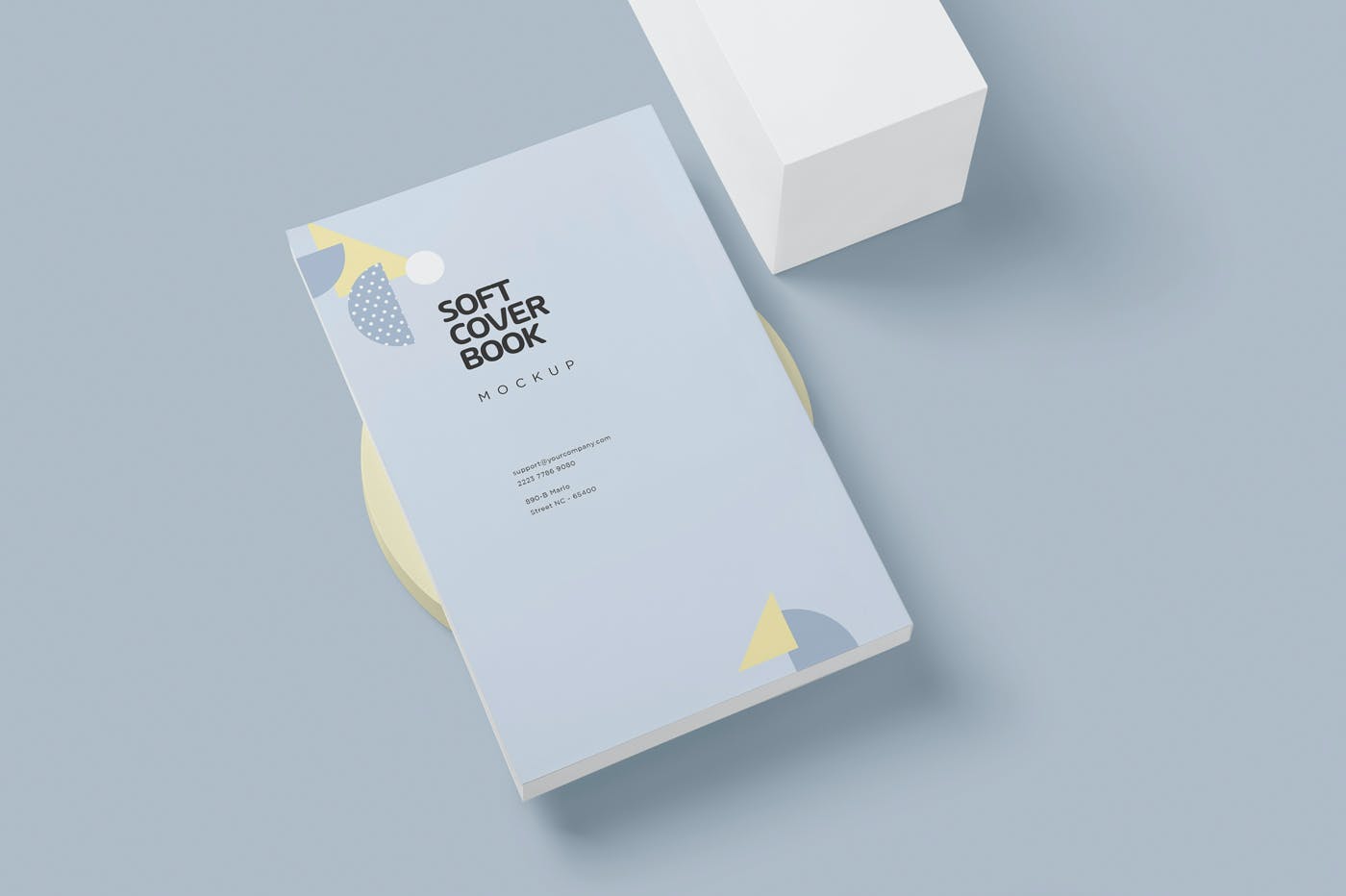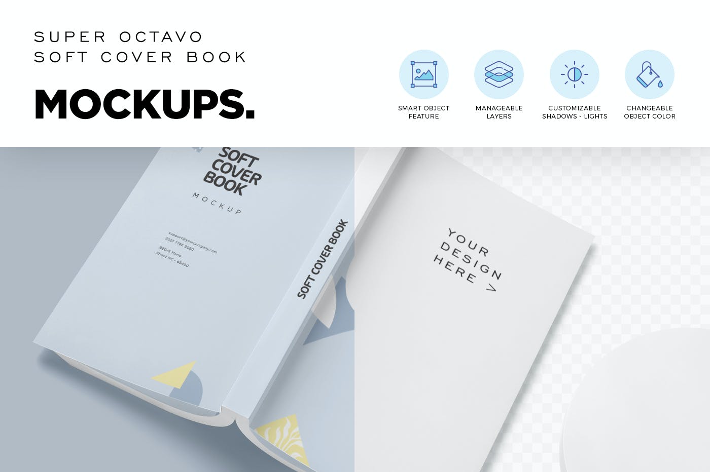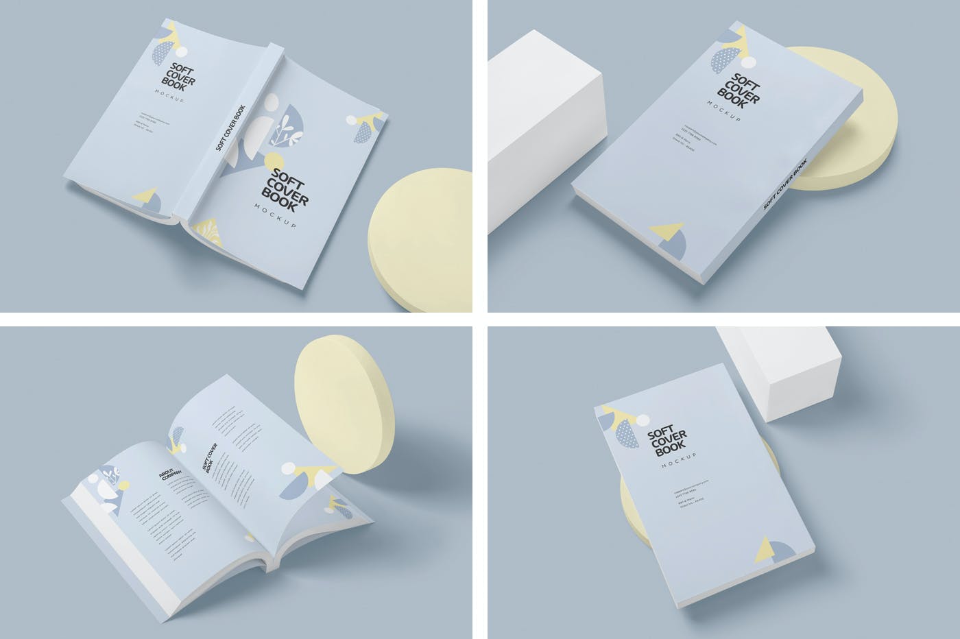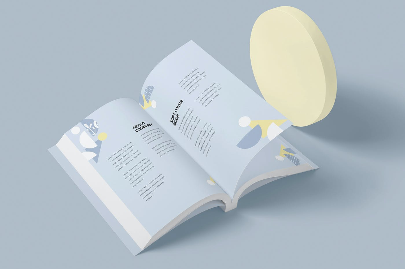 八字开软皮书籍效果图样机,将展示您的书籍封面和页面品牌设计。 这些样机提供不同的 PSD 来展示您的正面、背面和内页设计。 您可以使用智能对象和命名良好的图层来个性化设计、颜色、效果、阴影和背景。
