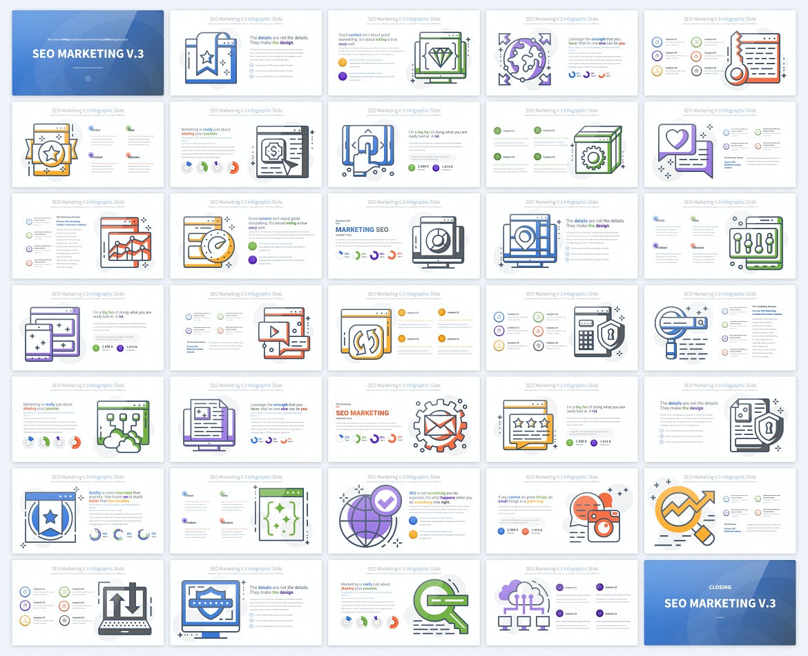 SEO Marketing V.3 PowerPoint信息图表幻灯片有33张独特的幻灯片/共35张幻灯片,它有很多功能。它是用幻灯片制作的,使定制变得非常容易。它有12种颜色,背景为浅色。它内置16:9全高清分辨率。所有演示都包括一张动画幻灯片和过渡。轻松编辑所有元素。适合那些想以简单有趣的方式展示自己业务的人。非常适合搜索引擎优化业务、解决方案、数字营销、战略业务、企业、目标、个人和专业用途等。