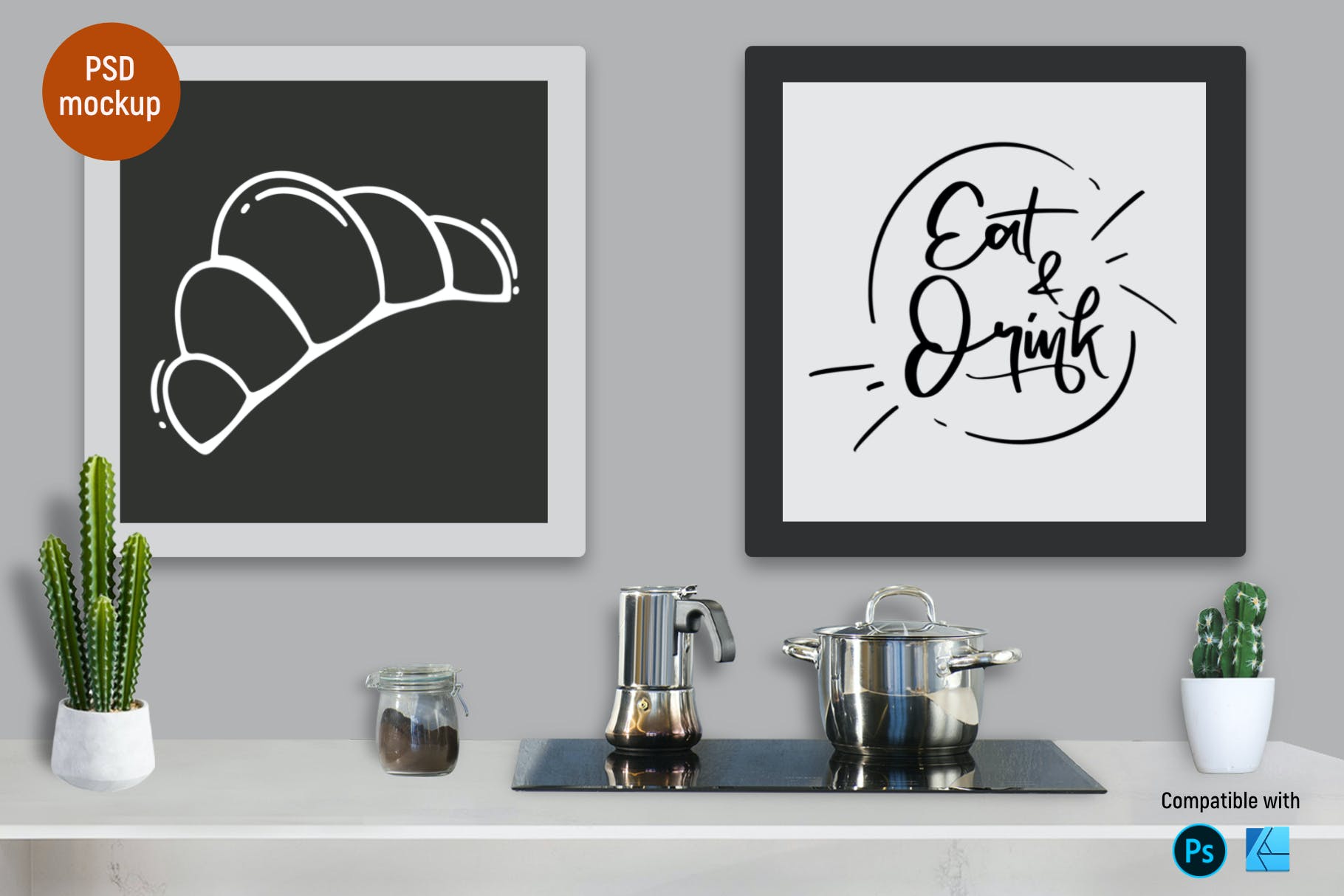 咖啡场景墙海报展示样机,此样机兼容 Photoshop 和 Affinity Designer。不包括示例艺术品,仅用于演示目的。