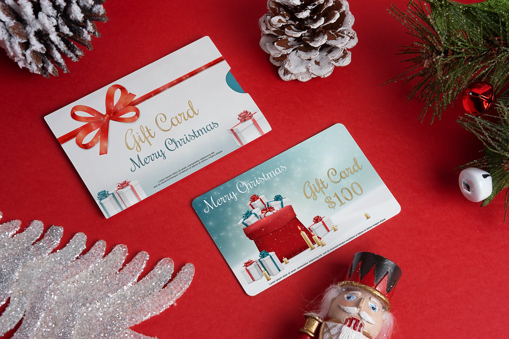 圣诞元素礼品卡设计样机,包括所有背景,智能对象系统,定制非常简单,放置您自己的设计、徽标、插图、更改背景颜色等!
