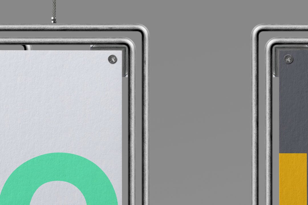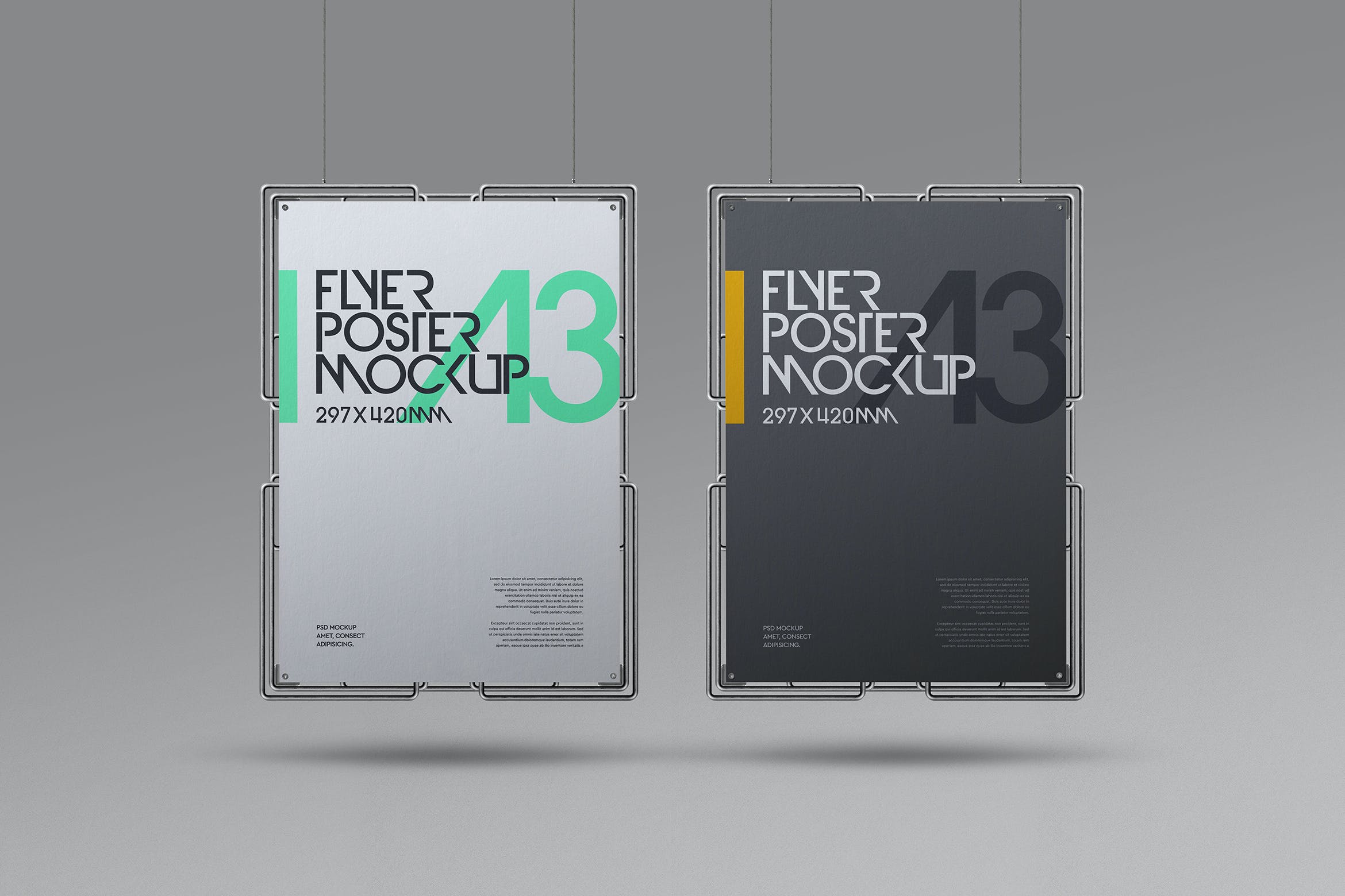吊挂金属框架A3尺寸海报样机套装,将帮助您改善演示文稿或任何其他项目。在这里您可以找到高质量的图像,以高分辨率拍摄。所有对象、灯光和阴影都单独分开。通过智能对象可以轻松编辑样机。非常适合印刷和Web设计。分开的对象;分离的光影层;多变的背景;使用智能对象放置您自己的图像。