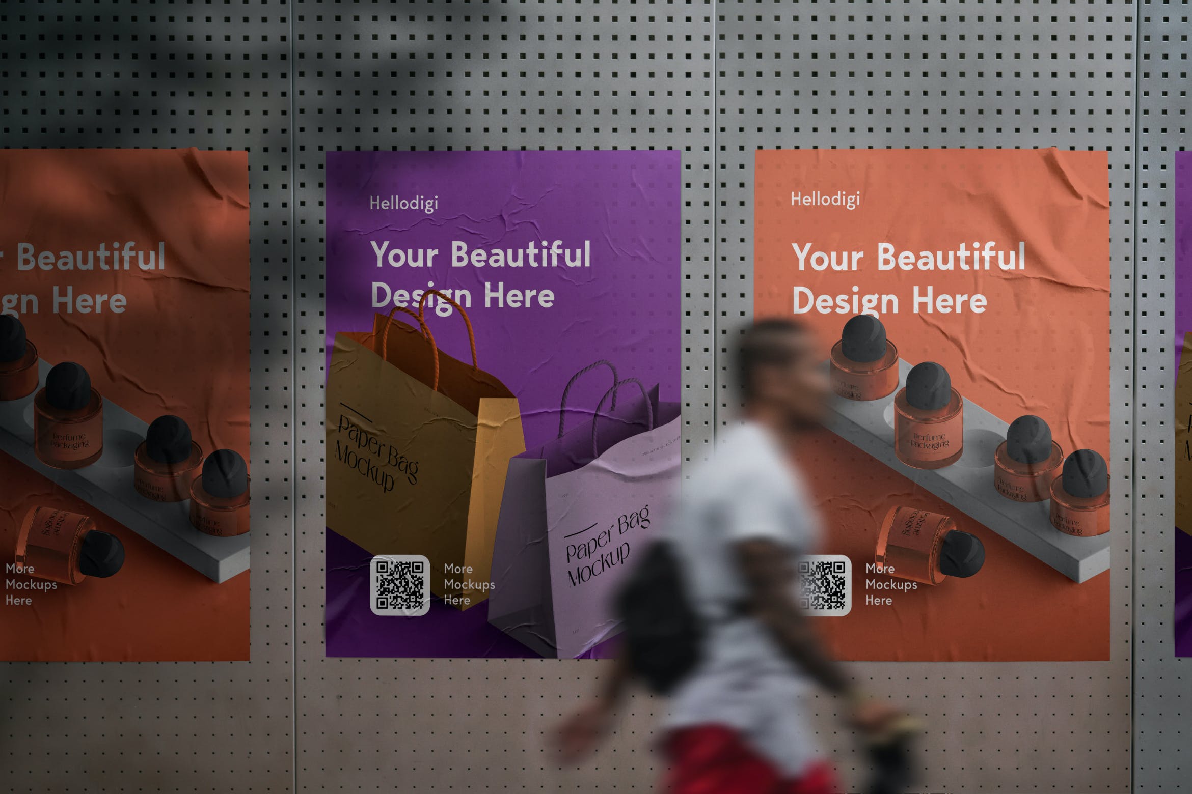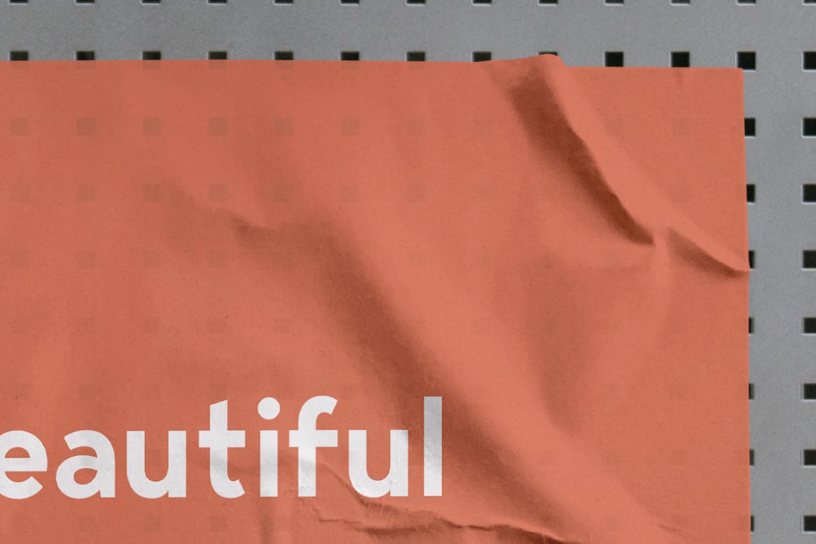 栅格铁墙张贴海报展示样机,智能对象图层(只需双击图层、放置设计并保存),高分辨率 6000x4000px, 300 dpi,所有对象和阴影单独分开,所有样机和物品都可以移动创建自己独特的场景。