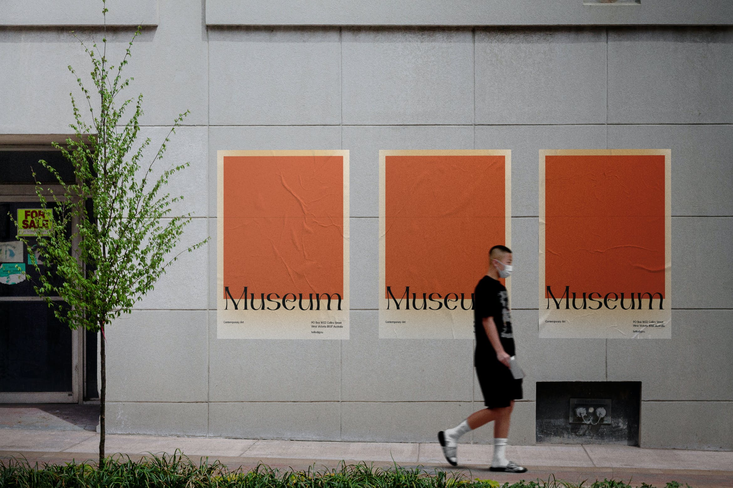墙体海报展示样机,智能对象图层(只需双击图层、放置设计并保存),高分辨率 6000x4000px, 300 dpi,所有对象和阴影单独分开,所有样机和物品都可以移动创建自己独特的场景。