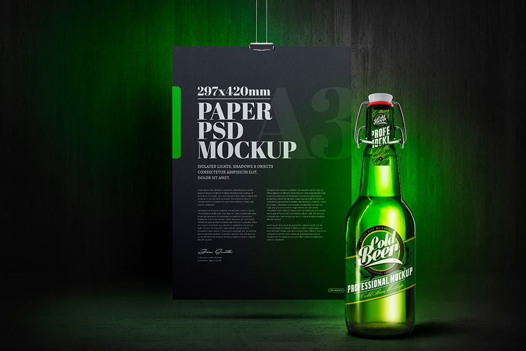 绿色暗黑场景A3海报&啤酒瓶样机,将帮助您改善演示文稿或任何其他项目。在这里您可以找到高质量的图像,以高分辨率拍摄。所有对象、灯光和阴影都单独分开。通过智能对象可以轻松编辑样机。非常适合印刷和Web设计。分开的对象;分离的光影层;多变的背景;使用智能对象放置您自己的图像。
