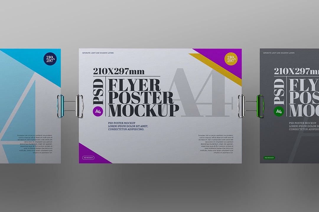 吊挂A4横向尺寸传单海报样机套装,将帮助您改善演示文稿或任何其他项目。在这里您可以找到高质量的图像,以高分辨率拍摄。所有对象、灯光和阴影都单独分开。通过智能对象可以轻松编辑样机。非常适合印刷和Web设计。分开的对象;分离的光影层;多变的背景;使用智能对象放置您自己的图像。