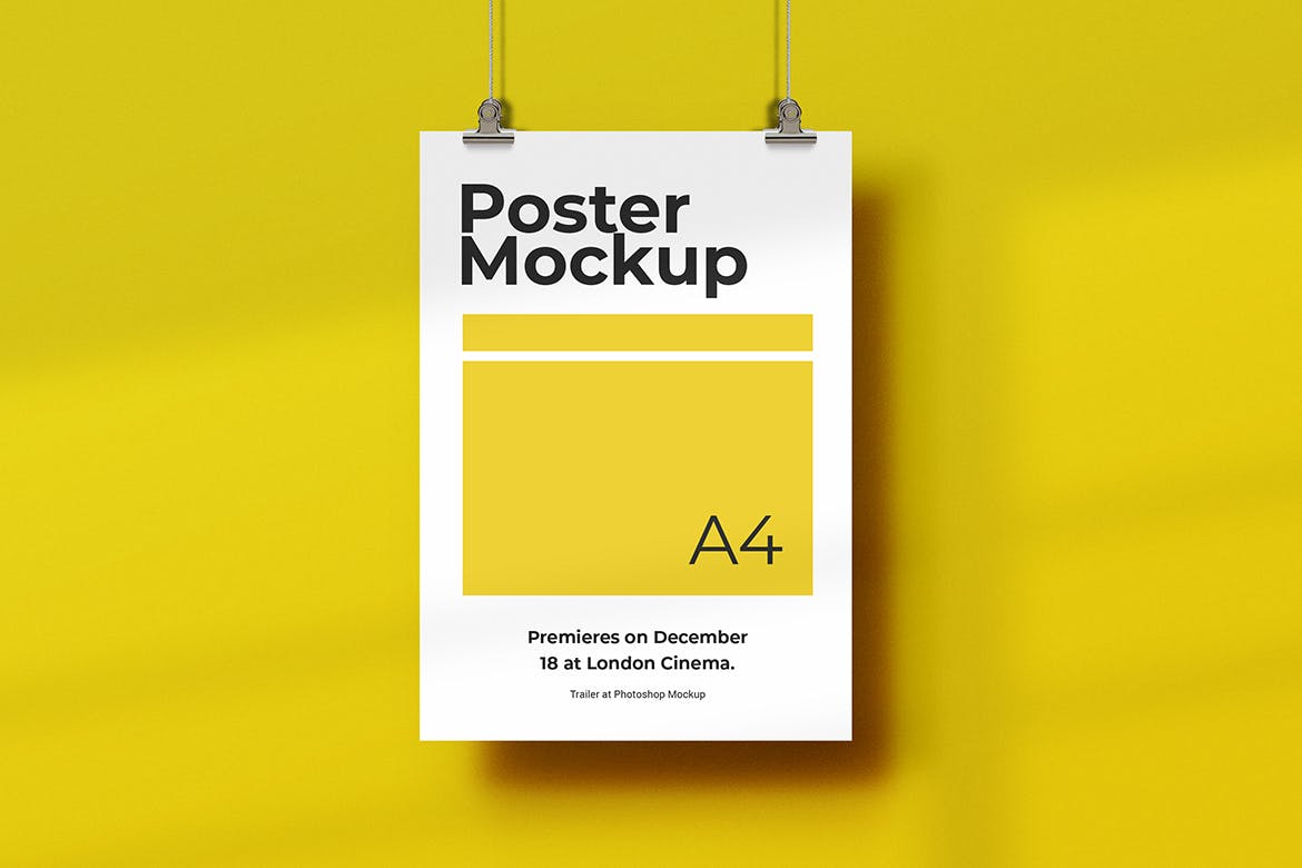 吊挂纸张海报设计样机, 将帮助您以最佳方式展示您的作品。 分辨率为3000x2000px, 在一秒钟内创建一个整洁的演示文稿。 只需打开 psd 文件并将您的设计放置到智能对象层点击保存即可。背景纹理选项和可编辑的背景颜色。