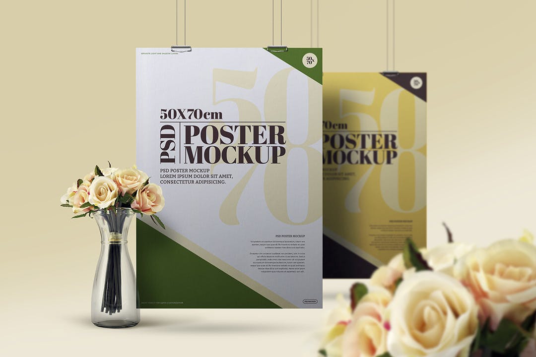 花束装饰金属夹吊挂50x70cm海报样机,将帮助您改善演示文稿或任何其他项目。在这里您可以找到高质量的图像,以高分辨率拍摄。所有对象、灯光和阴影都单独分开。通过智能对象可以轻松编辑样机。非常适合印刷和Web设计。分开的对象;分离的光影层;多变的背景;使用智能对象放置您自己的图像。