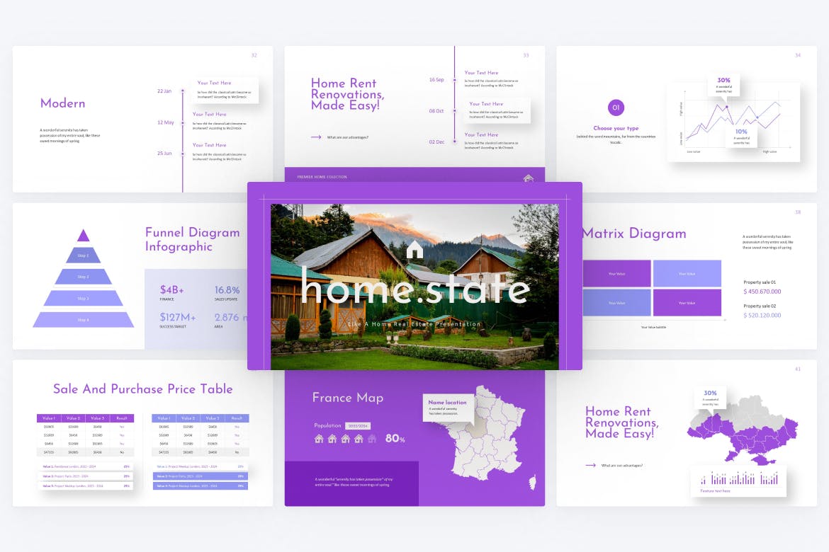 **Homestate Real Estate PowerPoint模板**如今我们可以很容易地找到许多令人惊叹的演示模板。因此,我们需要改变我们的思维方式,不仅要展示完美的幻灯片,还要提升其中的体验。在这里,我们向您展示一个信息图表包,让您在业务发展的每个阶段都有一个整体的品牌接触点,从开始一个新项目,在竞争对手中建立认可,到以一个改进的目标主张来完成。