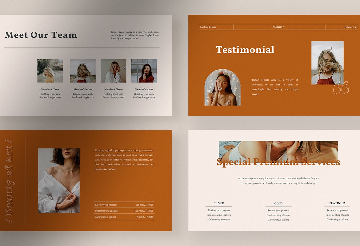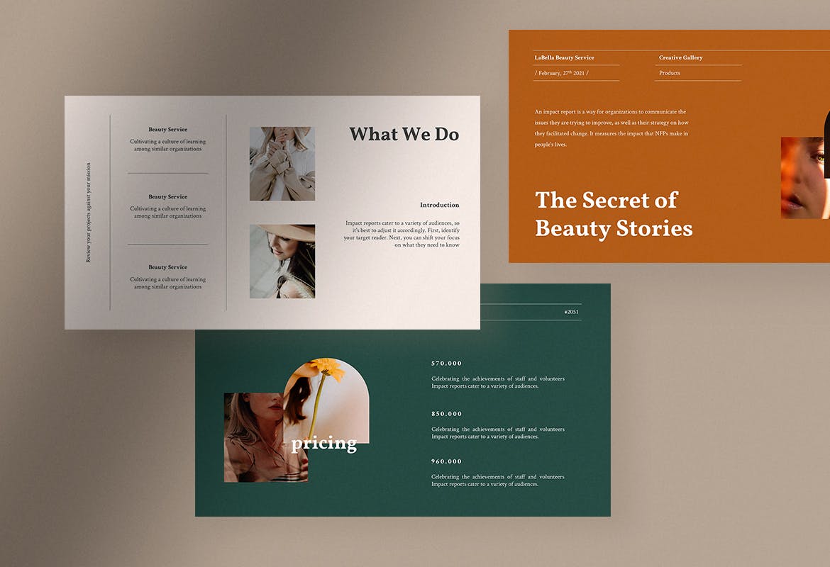 使用泥土的颜色使这个模板感觉温暖和优雅的美丽在每一张幻灯片。井然有序的布局和适当比例的文字、图像、图形或图表将帮助您做出完美的报价、商业建议或产品介绍。是有史以来最出色的美容服务。
