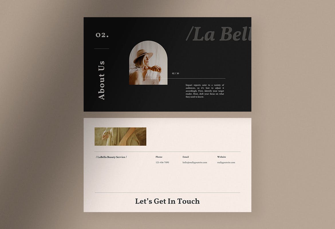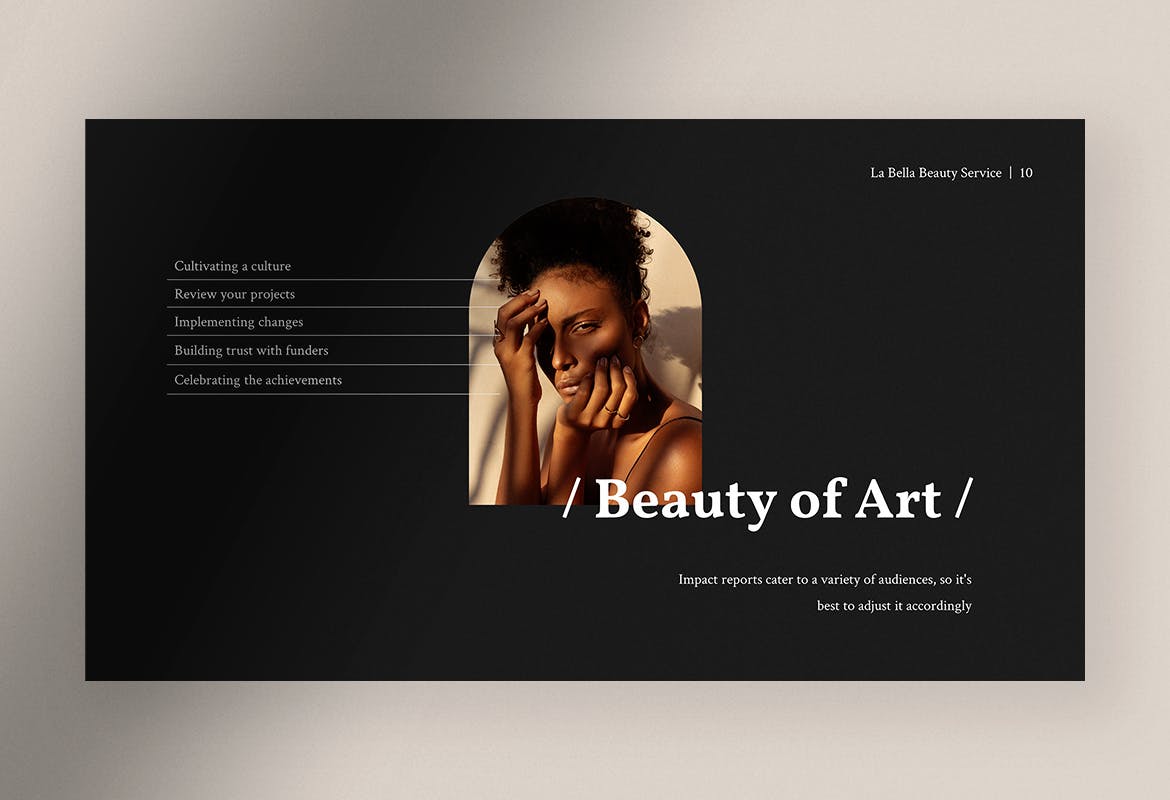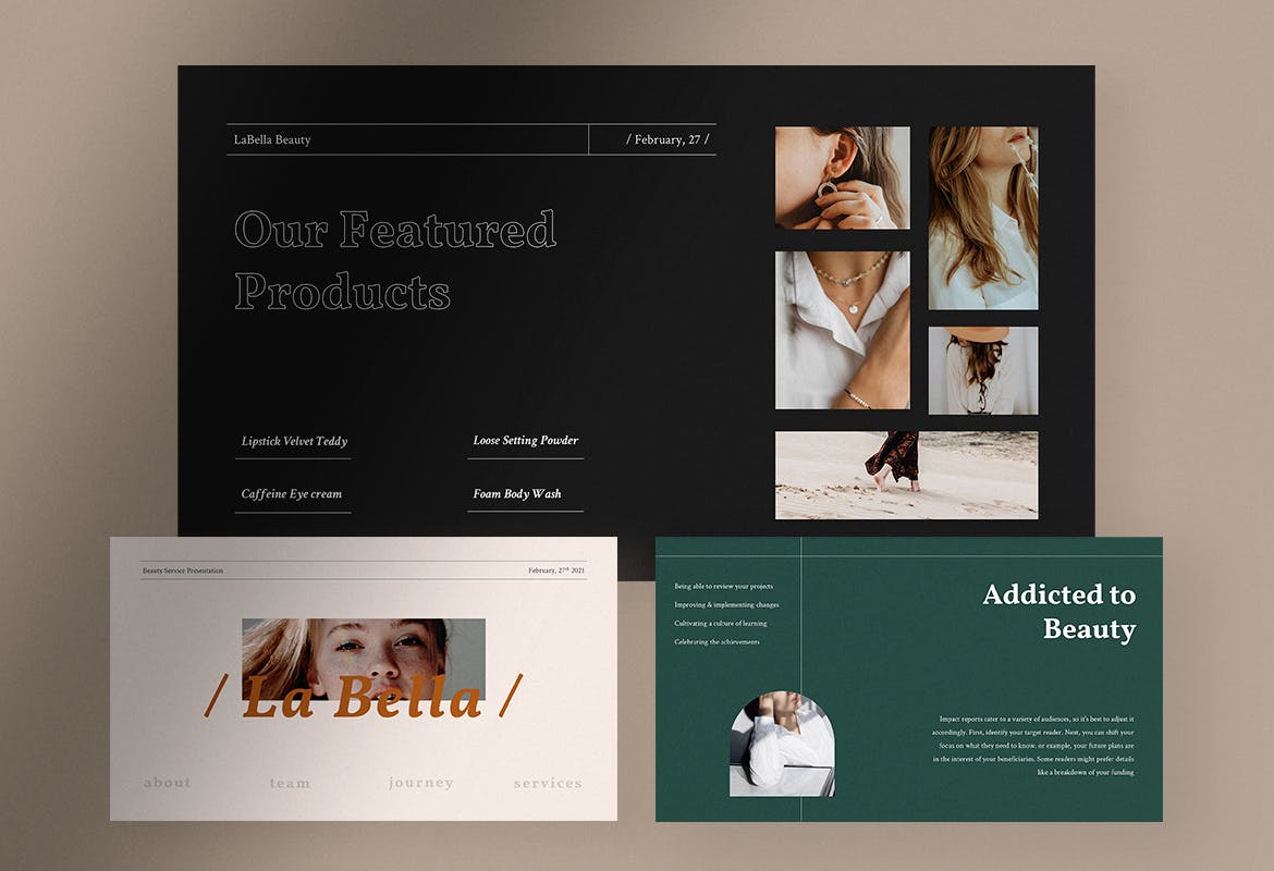 为了赢得美容服务提供商之间的竞争,您应该使用La Bella,美容服务演示模板,为您的客户、业务合作伙伴和客户呈现一个有吸引力和令人惊叹的演示文稿,该模板非常适合美容服务、沙龙、美体店、化妆品等。为您的营销团队和促销活动使用此演示模板。