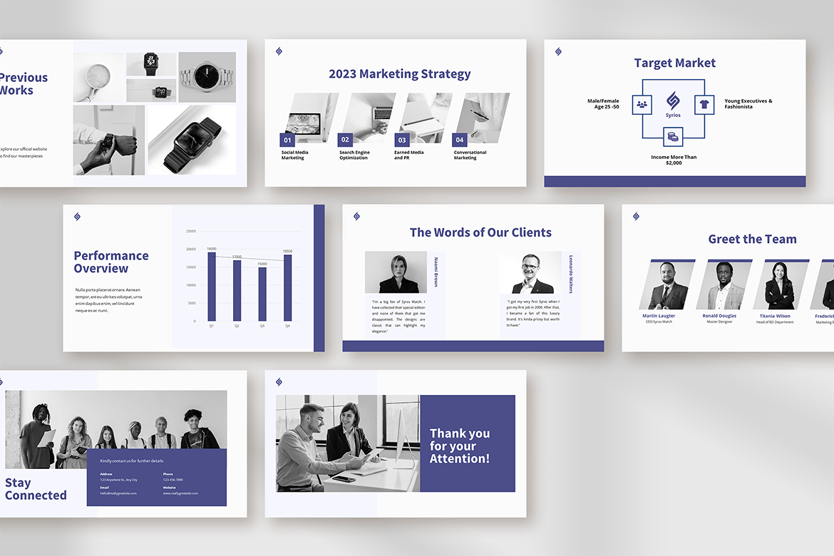 在白色背景上使用紫色和黑色可以营造出醒目的外观,帮助观众将注意力集中在演示文稿中的信息上。其现代风格保持了公司或商务演示的专业氛围。此外,它没有过多的装饰元素来分散观众的注意力。因此,您需要做的就是自信地交付计划。不要局限于将此模板用于商业计划,因为您可以将其应用于其他演示文稿,例如公司简介、业务报价等。