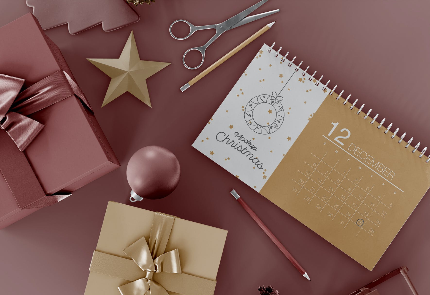 假期装饰元素活页日历设计样机模板,样机上有一个智能对象,可帮助您调整设计。 只需将其拖放即可。 使用起来非常简单。 通过使用纯色图层,易于重新着色。高分辨率(300 dpi)。享受优质的品质!下载文件中不包含样本设计。