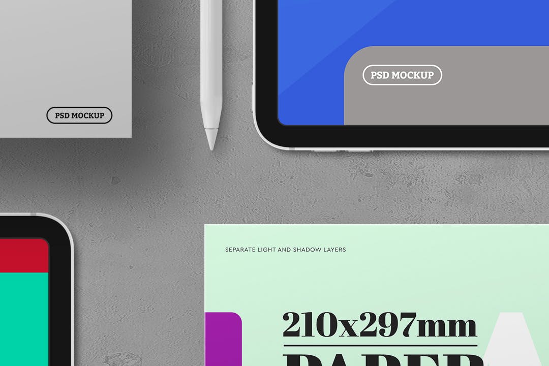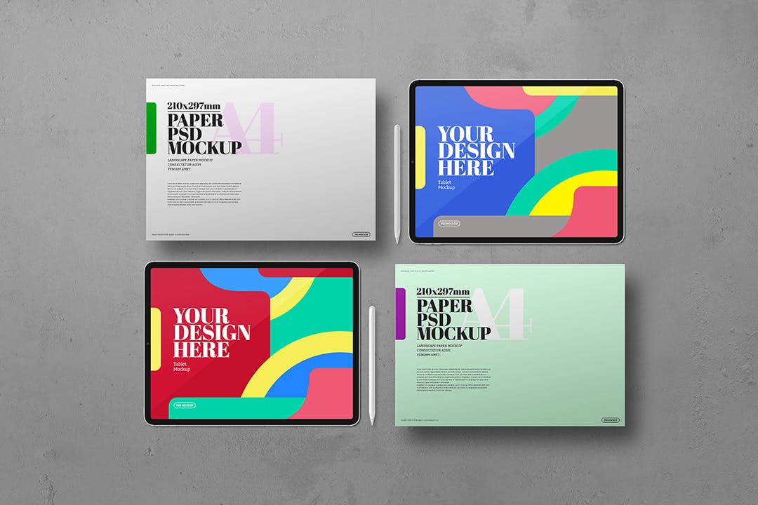 该A4横向尺寸海报&iPad样机素材将帮助您改善演示文稿或任何其他项目。在这里您可以找到高质量的图像,以高分辨率拍摄。所有对象、灯光和阴影都被单独分开。通过智能对象可以轻松编辑样机。非常适合印刷和网页设计,用质量和专业使您的客户感到惊讶!