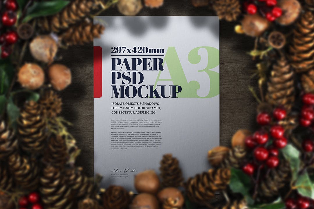 该圣诞花环场景A3尺寸传单海报样机素材将帮助您改善演示文稿或任何其他项目。在这里您可以找到高质量的图像,以高分辨率拍摄。所有对象、灯光和阴影都被单独分开。通过智能对象可以轻松编辑样机。非常适合印刷和网页设计,用质量和专业使您的客户感到惊讶!