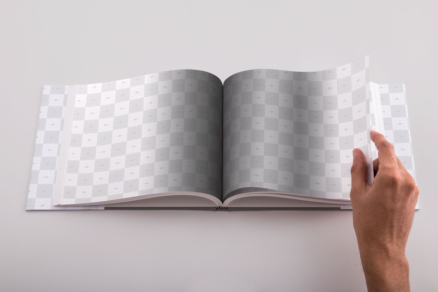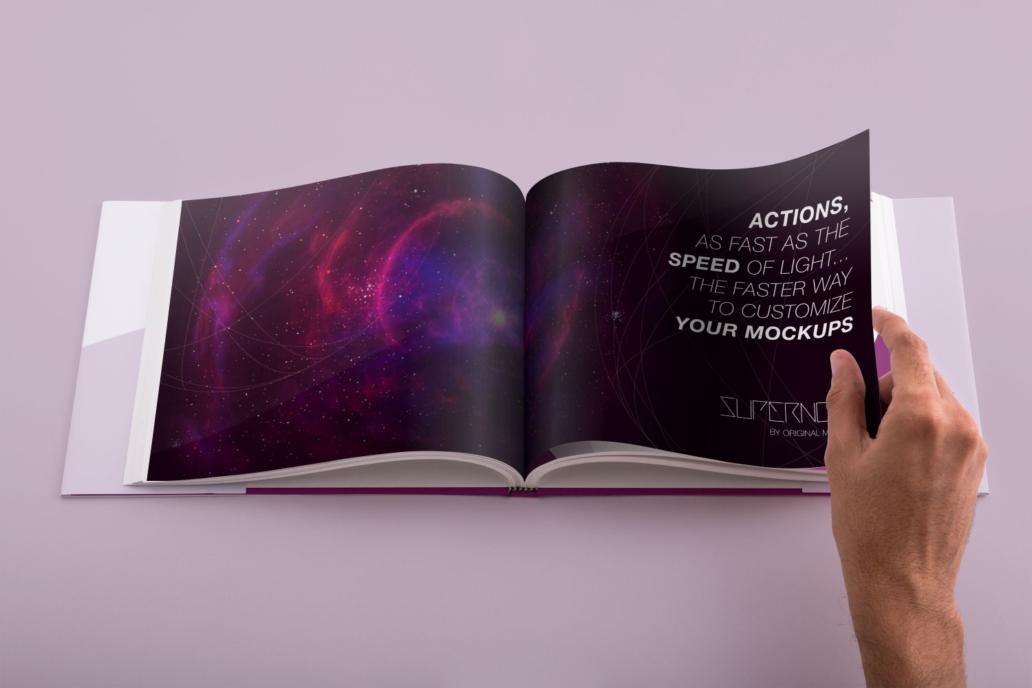 使用智能对象和Photoshop Actions可以快速轻松地自定义此标准横向尺寸精装书籍内页设计PSD样机。使用您喜欢的颜色自定义背景,以根据您的设计进行更好的呈现。