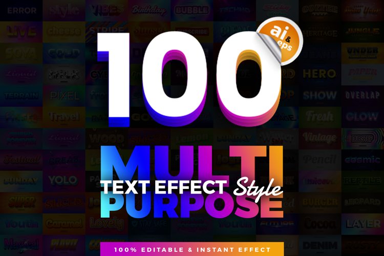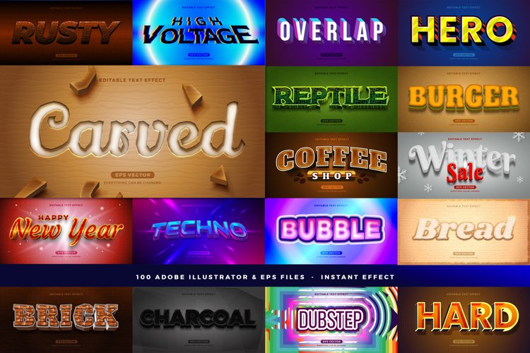 100款不同风格的Illustrator文本效果样式,一键节省时间。立竿见影!完全可定制。这些模板可使用Adobe Illustrator CC及更高版本进行自定义。超级好用,只需输入文字!100个Adobe Illustrator(.ai)和.eps文件,一键轻松编辑。