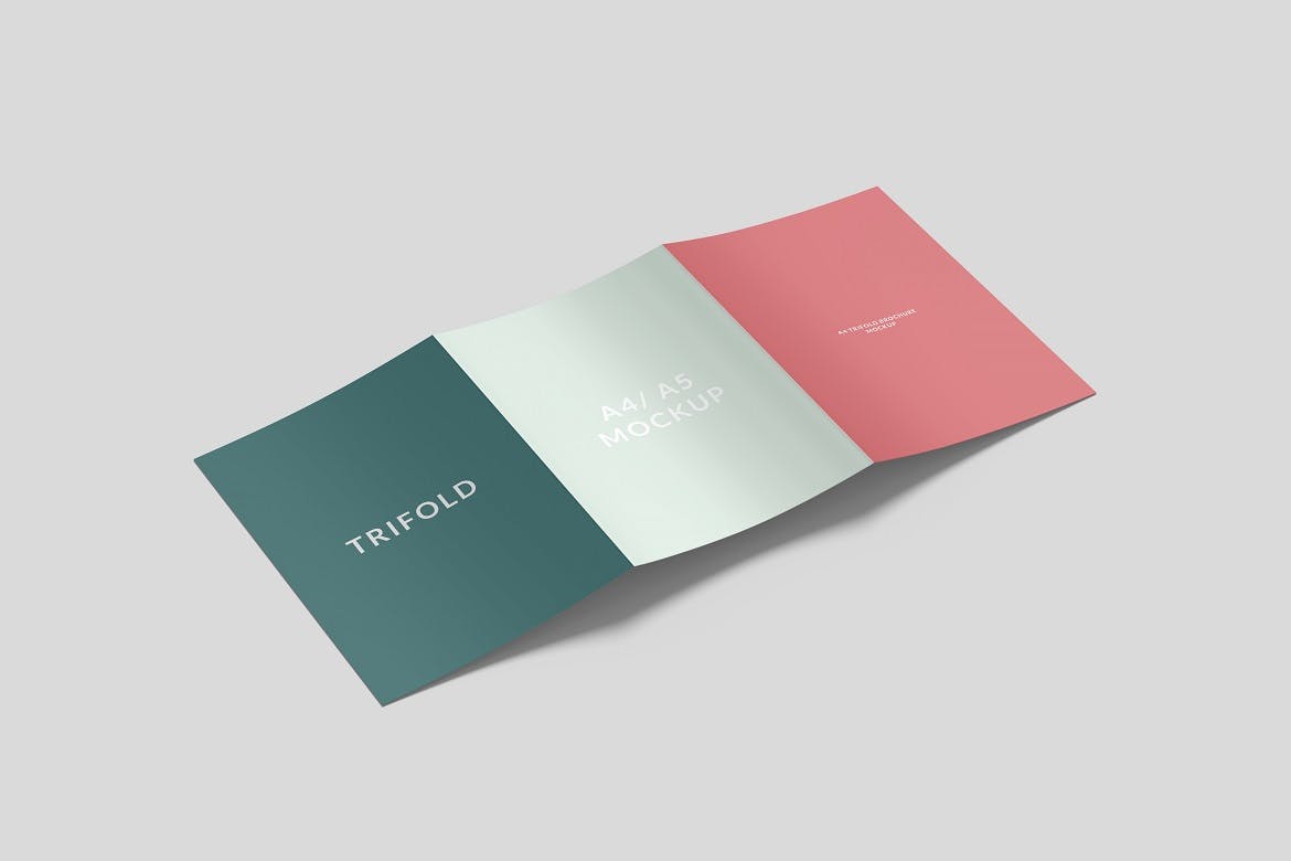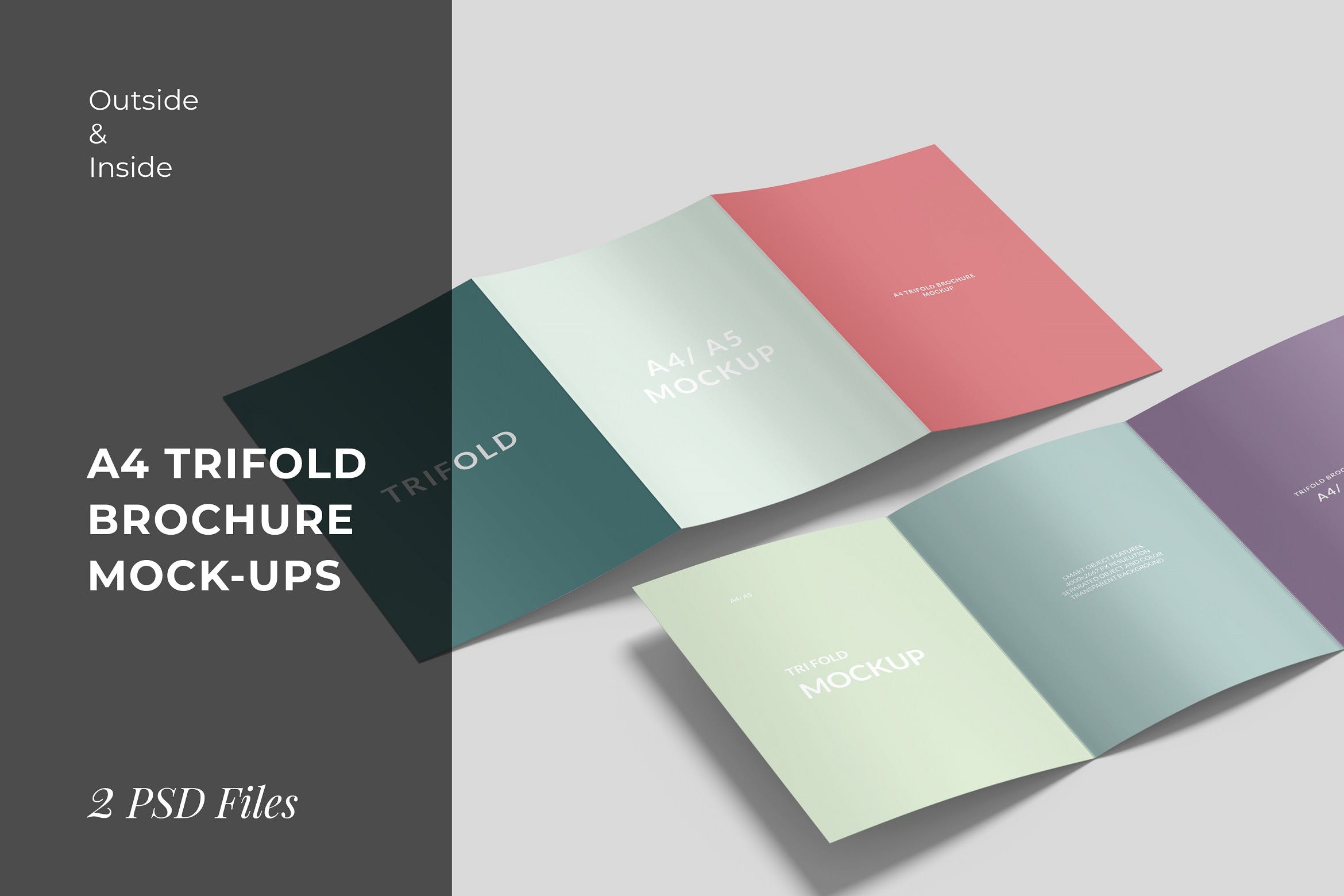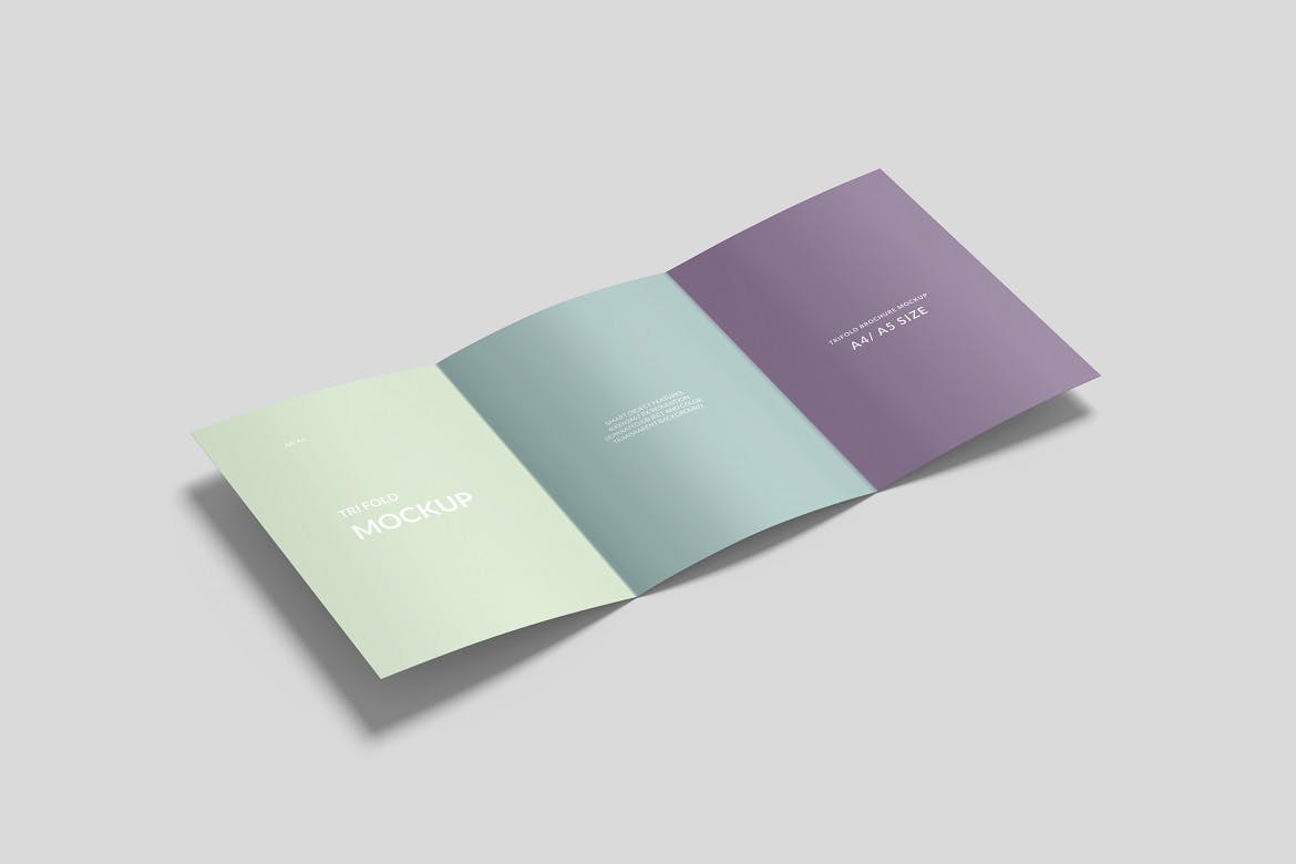 在此A4尺寸三折页宣传册样机中展示您的内页设计和封面设计,以实现逼真的预览。这是Photoshop文件的分层智能对象功能,可帮助您在设计中更改示例图像。