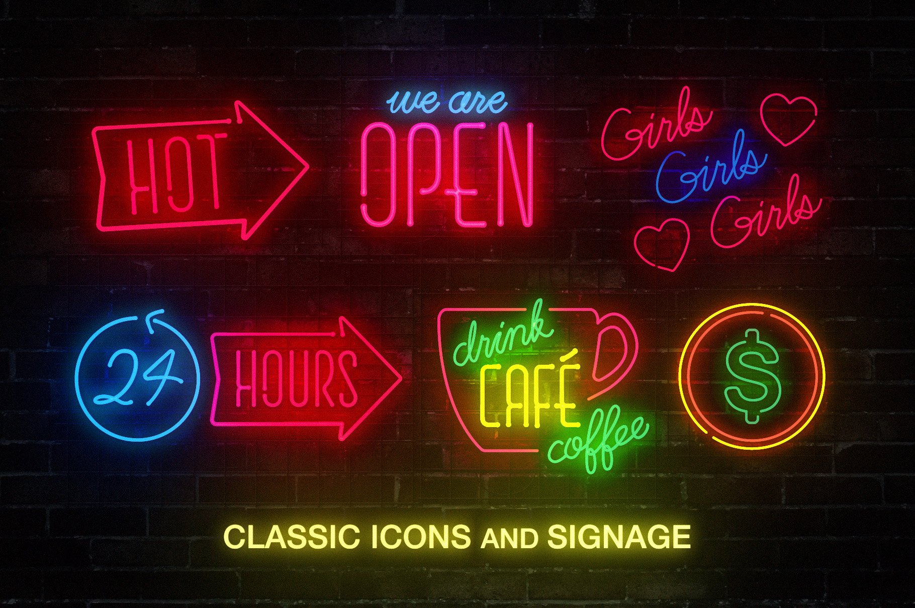 受霓虹灯启发的图形产品系列,其特征是一系列的图标,符号和新颖性标志,这些标志,标志和新颖性标志的灵感来自于我们所有人都想为自己的起居室提供的那些巨大的闪光灯。非常适合说明您的网站文章,宣传新产品,Instagram帖子,甚至作为3D场景中的资产-等待着许多有用和酷的东西!